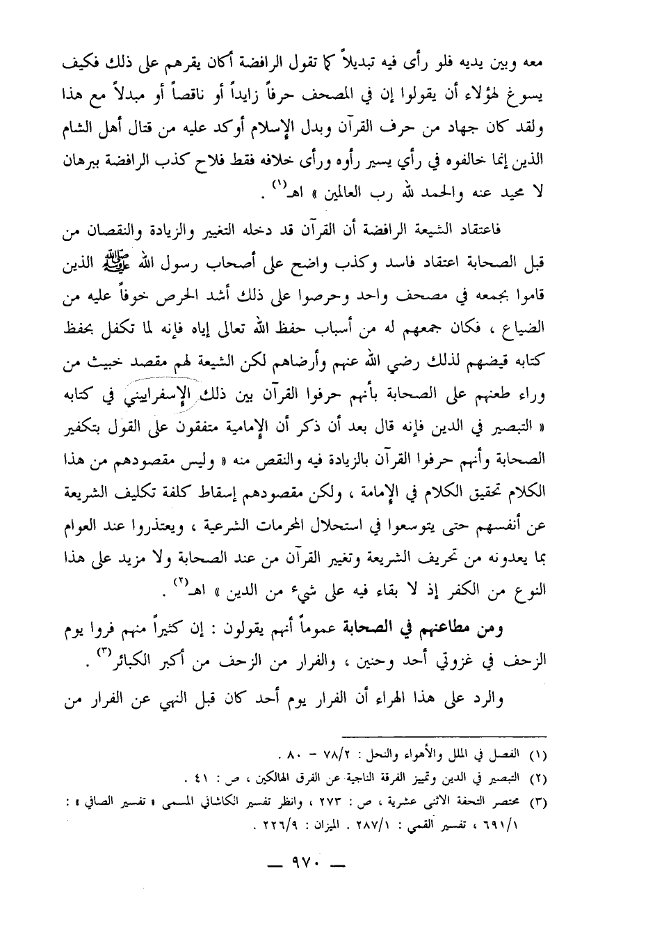 فاعتقاد الشيعة الرافضة أن القرآن قد دخله التغيير والزيادة والنقصان من قبل الصحابة اعتقاد فاسد وكذب واضح على أصحاب رسول الله صلى الله عليه وسلم الذين قاموا بجمعه في مصحف واحد وحرصوا على ذلك أشد الحرص خوفاً عليه من الضياع، فكان جمعهم له من أسباب حفظ الله تعالى إياه فإنه لما تكفل بحفظ كتابه قيضهم لذلك رضي الله عنهم وأرضاهم لكن الشيعة لهم مقصد خبيث من وراء طعنهم على الصحابة بأنهم حرفوا القرآن بين ذلك الإسفرائيني في كتابه "التبصير في الدين فإنه قال بعد أن ذكر أن الإمامية متفقون على القول بتكفير الصحابة وأنهم حرفوا القرآن بالزيادة فيه والنقص منه "وليس مقصودهم من هذا الكلام تحقيق الكلام في الإمامة، ولكن مقصودهم إسقاط كلفة تكليف الشريعة عن أنفسهم حتى يتوسعوا في استحلال المحرمات الشرعية، ويعتذروا عند العوام بما يعدونه من تحريف الشريعة وتغيير القرآن من عند الصحابة ولا مزيد على هذا النوع من الكفر إذ لا بقاء فيه على شيء من الدين"أهـ2.