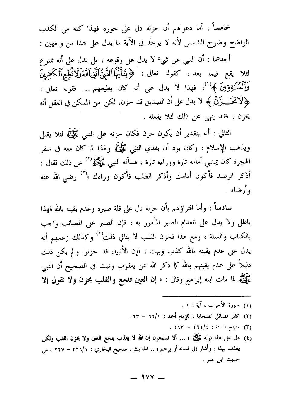 سادساً: وأما افتراؤهم بأن حزنه دل على قلة صبره وعدم يقينه بالله فهذا باطل ولا يدل على انعدام الصبر المأمور به، فإن الصبر على المصائب واجب بالكتاب والسنة، ومع هذا فحزن القلب لا ينافي ذلك4 وكذلك زعمهم أنه يدل على عدم يقينه بالله كذب وبهت، فإن الأنبياء قد حزنوا ولم يكن ذلك دليلاً على عدم يقينهم بالله كما ذكر الله عن يعقوب وثبت في الصحيح أن النبي صلى الله عليه وسلم لما مات ابنه إبراهيم وقال: "إن العين لتدمع وإن القلب ليحزن ولا نقول إلا