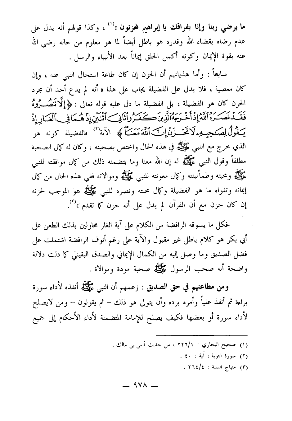 سابعاً: وأما هذيانهم أن الحزن إن كان طاعة استحال النهي عنه وإن كان معصية، فلا يدل على الفضيلة يجاب على هذا "أنه لم يدع أحد أن مجرد الحزن كان هو الفضيلة، بل الفضيلة ما دل عليه قوله تعالى: {إِلاّ تَنْصُرُوهُ فَقَدْ نَصَرَهُ اللَّهُ إِذْ أَخْرَجَهُ الَّذِينَ كَفَرُوا ثَانِيَ اثْنَيْنِ إِذْ هُمَا فِي الْغَارِ إِذْ يَقُولُ لِصَاحِبِهِ لا تَحْزَنْ إِنَّ اللَّهَ مَعَنَا} الآية2 فالفضيلة كونه هو الذي خرج مع النبي صلى الله عليه وسلم في هذه الحال واختص بصحبته، وكان له كمال الصحبة مطلقاً وقول النبي صلى الله عليه وسلم له إن الله معنا وما يتضمنه ذلك من كمال موافقته للنبي صلى الله عليه وسلم ومحبته وطمأنينته وكمال معونته للنبي صلى الله عليه وسلم وموالاته ففي هذه الحال من كمال إيمانه وتقواه ما هو الفضيلة وكمال محبته ونصره للنبي صلى الله عليه وسلم هو الموجب لحزنه إن كان حزن مع أن القرآن لم يدل على أنه حزن كما تقدم"3.
