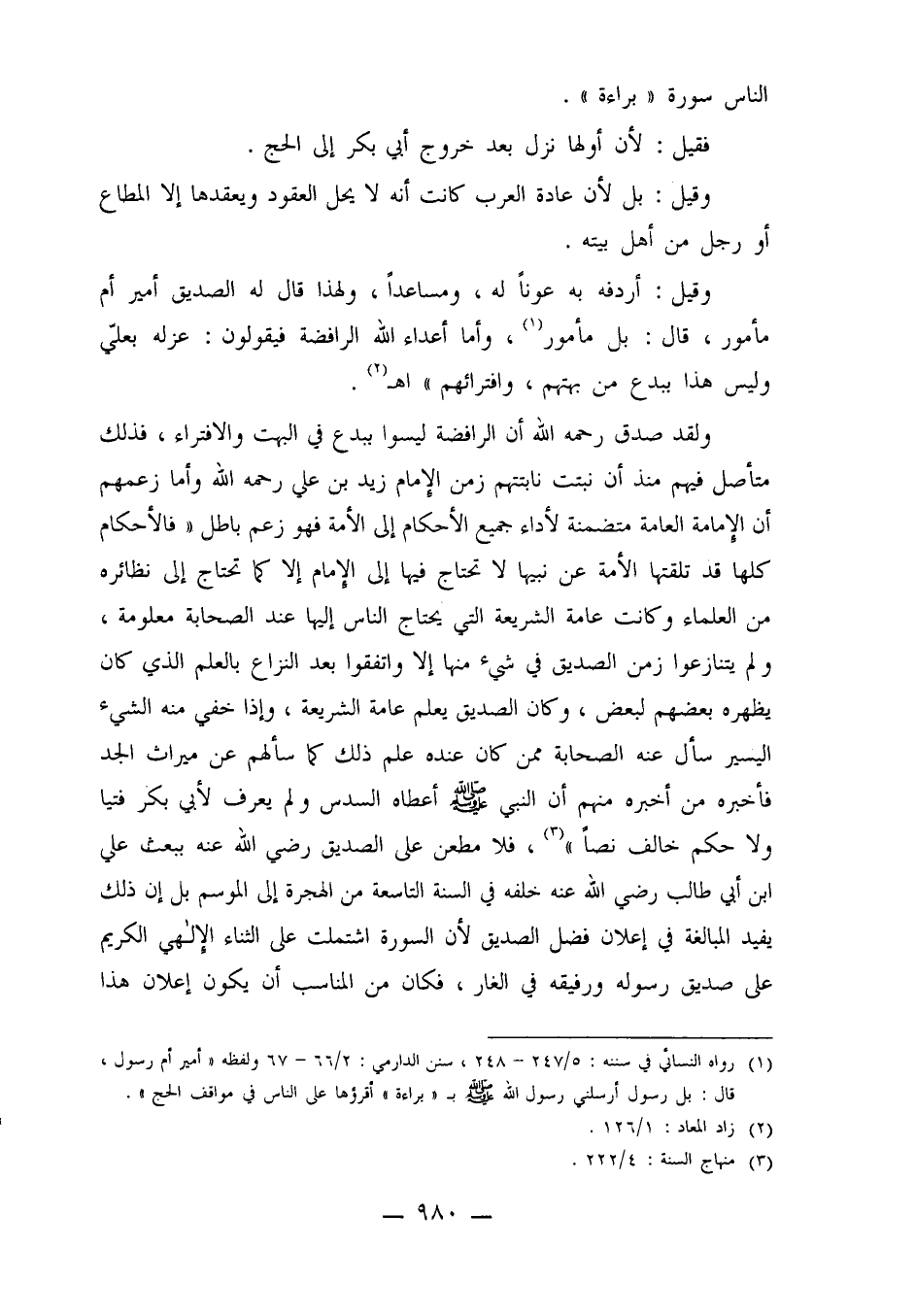 ولقد صدق رحمه الله أن الرافضة ليسوا ببدع في البهت والافتراء، فذلك متأصل فيهم منذ أن نبتت نابتتهم زمن الإمام زيد بن علي رحمه الله وأما زعمهم أن الإمامة العامة متضمنة لأداء جميع الأحكام إلى الأمة فهو زعم باطل "فالأحكام كلها قد تلقتها الأمة عن نبيها لا تحتاج فيها إلى الإمام إلا كما تحتاج إلى نظائره من العلماء وكانت عامة الشريعة التي يحتاج الناس إليها عند الصحابة معلومة، ولم يتنازعوا زمن الصديق في شيء منها إلا واتفقوا بعد النزاع بالعلم الذي كان يظهره بعضهم لبعض، وكان الصديق يعلم عامة الشريعة، وإذا خفي منه الشيء اليسير سأل عنه الصحابة ممن كان عنده علم ذلك كما سألهم عن ميراث الجد فأخبره من أخبره منهم أن النبي صلى الله عليه وسلم أعطاه السدس، ولم يعرف لأبي بكر فتيا ولا حكم خالف نصاً"3، فلا مطعن على الصديق رضي الله عنه ببعث علي بن أبي طالب رضي الله عنه خلفه في السنة التاسعة من الهجرة إلى الموسم بل إن ذلك يفيد المبالغة في إعلان فضل الصديق لأن السورة اشتملت على الثناء الإلهي الكريم على صديق رسوله ورفيقه في الغار، فكان من المناسب أن يكون إعلان هذا