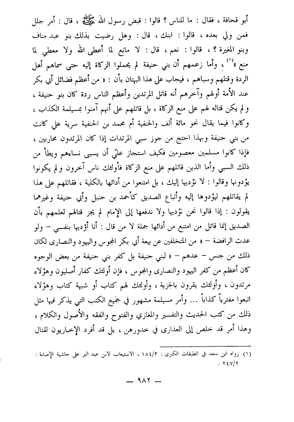 أبو قحافة، فقال: ما للناس؟ قالوا: قبض رسول الله صلى الله عليه وسلم، قال: أمر جلل فمن ولي بعده، قالوا: ابنك، قال: وهل رضيت بذلك بنو عبد مناف وبنو المغيرة؟، قالوا: نعم، قال: لا مانع لما أعطى الله ولا معطي لما منع"1، وأما زعمهم أن بني حنيفة لم يحملوا الزكاة إليه حتى سماهم أهل الردة وقتلهم وسباهم، فيجاب على هذا البهتان بأن: "من أعظم فضائل أبي بكر عند الأمة أولهم وآخرهم أنه قاتل المرتدين وأعظم الناس ردة كان بنو حنيفة، ولم يكن قتاله لهم على منع الزكاة، بل قاتلهم على أنهم آمنوا بمسيلمة الكذاب، وكانوا فيما يقال نحو مائة ألف والحنفية أم محمد بن الحنفية سرية علي كانت من بني حنيفة وبهذا احتج من جوز سبي المرتدات إذا كان المرتدون محاربين فإذا كانوا مسلمين معصومين فكيف استجاز علي أن يسبى نساءهم ويطأ من ذلك السبي وأما الذين قاتلهم على منع الزكاة فأولئك ناس آخرون ولم يكونوا يؤدونها وقالوا: لا نؤديها إليك، بل امتنعوا من أدائها بالكلية فقاتلهم على هذا لم يقاتلهم ليؤدوها إليه وأتباع الصديق كأحمد بن حنبل وأبي حنيفة وغيرهما يقولون: إذا قالوا نحن نؤديها ولا ندفعها إلى الإمام لم يجز قتالهم لعلمهم بأن الصديق إنما قاتل من امتنع من أدائها جملة لا من قال: أنا أؤديها بنفسي ـ ولو عدت الرافضة ـ "من المتخلفين عن بيعة أبي بكر المجوس واليهود والنصارى لكان ذلك من جنس ـ عدهم ـ "لبني حنيفة بل كفر بني حنيفة من بعض الوجوه كان أعظم من كفر اليهود والنصارى والمجوس، فإن أولئك كفار أصليون وهؤلاء مرتدون، وأولئك يقرون بالجزية، وأولئك لهم كتاب أو شبهة كتاب وهؤلاء اتبعوا مفترياً كذاباً ... وأمر مسيلمة مشهور في جميع الكتب التي يذكر فيها مثل ذلك من كتب الحديث والتفسير والمغازي والفتوح والفقه والأصول والكلام، وهذا أمر قد خلص إلى العذارى في خدورهن، بل قد أفرد الإخباريون لقتال