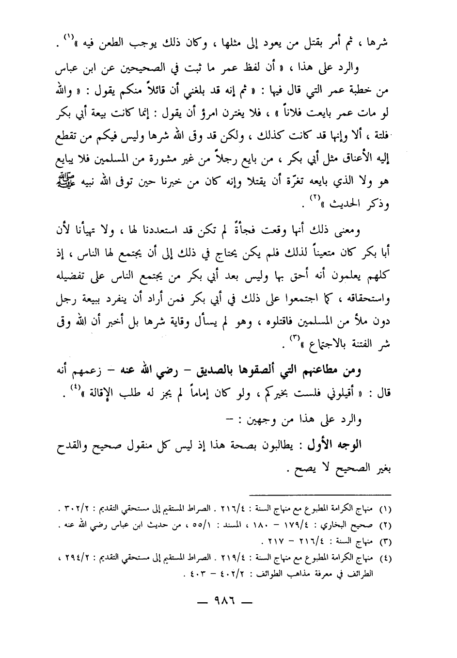 والرد على هذا، "أن لفظ عمر ما ثبت في الصحيحن عن ابن عباس من خطبة عمر التي قال فيها: "ثم إنه قد بلغني أن قائلاً منكم يقول: "والله لو مات عمر بايعت فلاناً" فلا يغترن امرؤ أن يقول: إنما كانت بيعة أبي بكر فلتة، ألا وإنها قد كانت كذلك، ولكن قد وقى الله شرها وليس فيكم من تقطع إليه الأعناق مثل أبي بكر، من بايع رجلاً من غير مشورة من المسلمين فلا يبايع هو ولا الذي بايعه تغره أن يقتلا وإنه كان من خيرنا حين توفى الله نبيه صلى الله عليه وسلم وذكر الحديث"2.