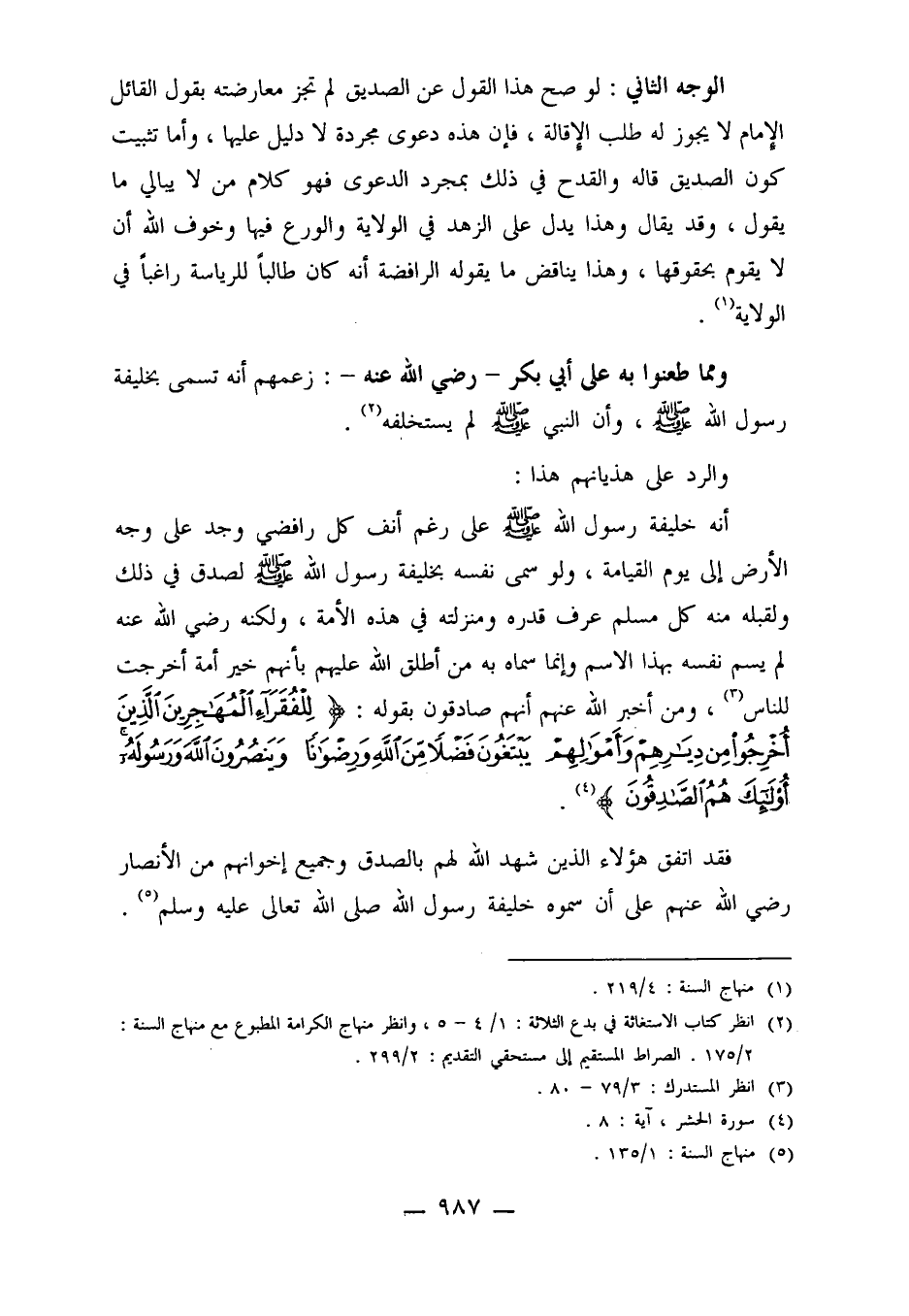الوجه الثاني: لو صح هذا القول عن الصديق لم تجز معارضته بقول القائل الإمام لا يجوز له طلب الإقالة، فإن هذه دعوى مجردة لا دليل عليها، وأما تثبيت كون الصديق قاله والقدح في ذلك بمجرد الدعوى فهو كلام من لا يبالي ما يقول، وقد يقال وهذا يدل على الزهد في الولاية والورع فيها وخوف الله أن لا يقوم بحقوقها، وهذا يناقض ما يقوله الرافضة أنه كان طالباً للرياسة راغباً في الولاية1.
