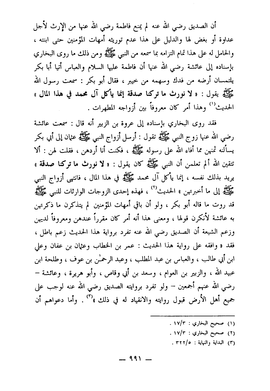 أن الصديق رضي الله عنه لم يمنع فاطمة رضي الله عنها من الإرث لأجل عداوة أو بعض لها والدليل على هذا عدم توريثه أمهات المؤمنين حتى ابنته، والحامل له على هذا تمام التزامه بما سمعه من النبي صلى الله عليه وسلم ومن ذلك ما روى البخاري بإسناده إلى عائشة رضي الله عنها أن فاطمة عليها السلام والعباس أتيا أبا بكر يلتمسان أرضه من فدك وسهمه من خيبر، فقال أبو بكر: سمعت رسول الله صلى الله عليه وسلم يقول: " لا نورث ما تركنا صدقة إنما يأكل آل محمد في هذا المال" الحديث1 وهذا أمر كان معروفاً بين أزواجه المطهرات.