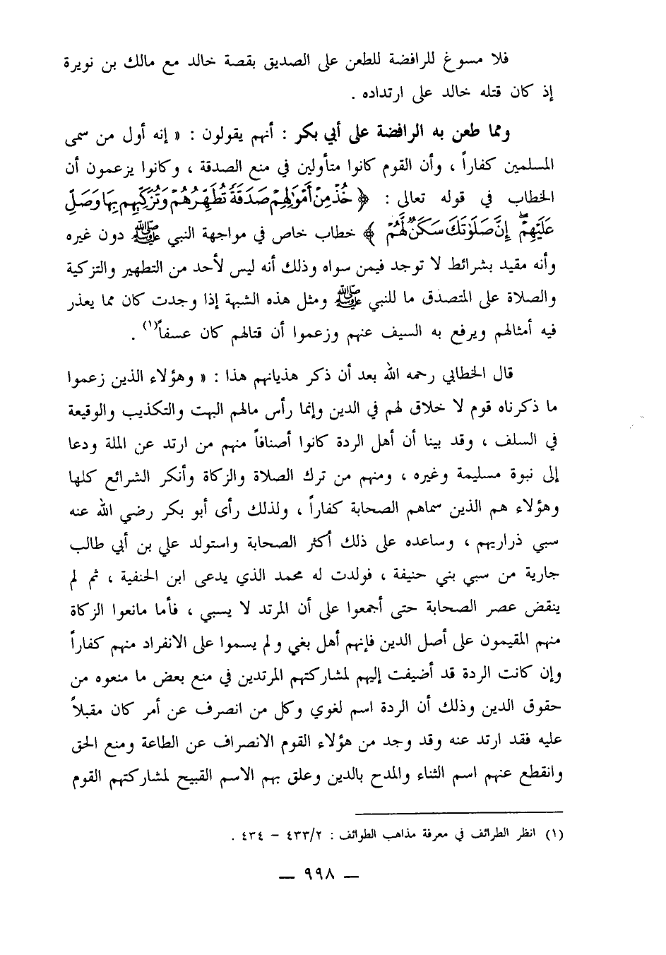 ومما طعن به الرافضة على أبي بكر: أنهم يقولون: "إنه أول من سمى المسلمين كفاراً، وأن القوم كانوا متأولين في منع الصدقة، وكانوا يزعمون أن الخطاب في قوله تعالى: {خُذْ مِنْ أَمْوَالِهِمْ صَدَقَةً تُطَهِّرُهُمْ وَتُزَكِّيهِمْ بِهَا وَصَلِّ عَلَيْهِمْ إِنَّ صَلاتَكَ سَكَنٌ لَهُمْ} خطاب خاص في مواجهة النبي صلى الله عليه وسلم دون غيره وأنه مقيد بشرائط لا توجد فيمن سواه وذلك أنه ليس لأحد من التطهير والتزكية والصلاة على المتصدق ما للنبي صلى الله عليه وسلم ومثل هذه الشبهة إذا وجدت كان مما يعذر فيه أمثالهم ويرفع به السيف عنهم وزعموا أن قتالهم كان عسفاً1.