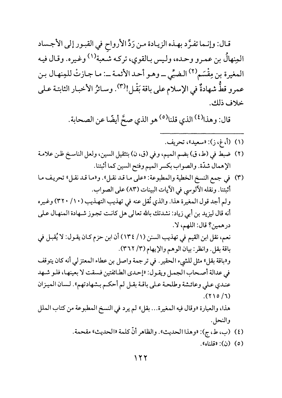 قال: وإنما تفرَّد بهذه الزيادة من رَدِّ الأرواحِ في القبور إلى الأجساد المِنهالُ بن عمرو وحده، وليس بالقوي، تركه شعبة (¬١) وغيره. وقال فيه المغيرة بن مِقْسَم (¬٢) الضبِّي ــ وهو أحد الأئمة ــ: ما جازتْ للمِنهال بن عمرو قطُّ شهادةٌ في الإسلام على باقة بَقْل! (¬٣).