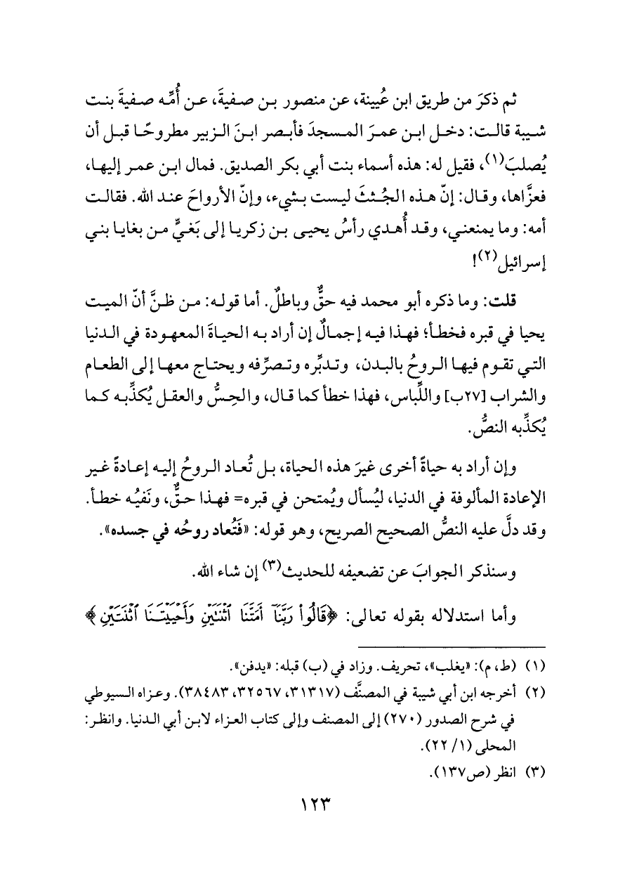 قلت: وما ذكره أبو محمد فيه حقٌّ وباطلٌ. أما قوله: من ظنَّ أنّ الميت يحيا في قبره فخطأ؛ فهذا فيه إجمالٌ إن أراد به الحياةَ المعهودة في الدنيا التي تقوم فيها الروحُ بالبدن، وتدبِّره وتصرِّفه ويحتاج معها إلى الطعام والشراب [٢٧ ب] واللِّباس، فهذا خطأ كما قال، والحِسُّ والعقل يُكذِّبه كما يُكذِّبه النصُّ.
