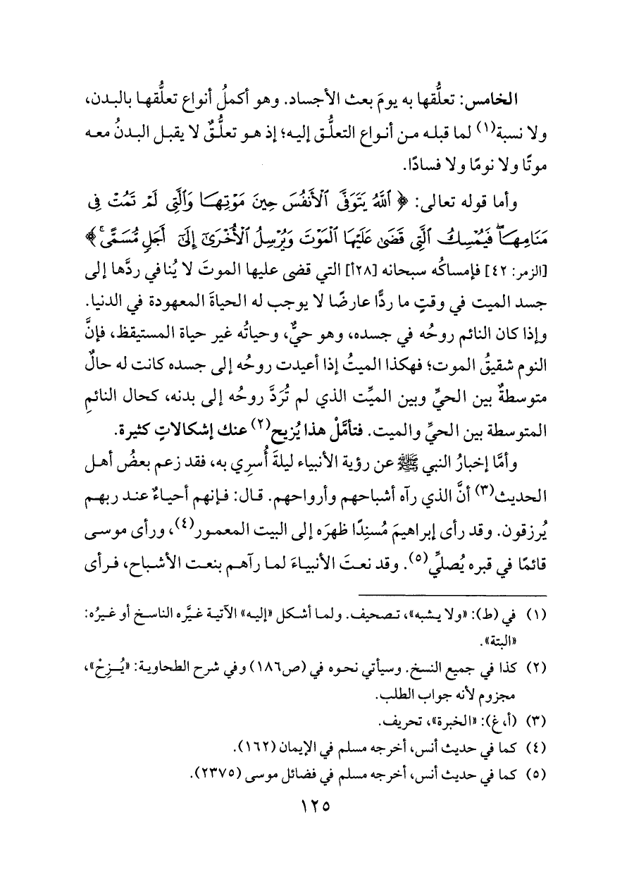 وأما قوله تعالى: {اللَّهُ يَتَوَفَّى الْأَنْفُسَ حِينَ مَوْتِهَا وَالَّتِي لَمْ تَمُتْ فِي مَنَامِهَا فَيُمْسِكُ الَّتِي قَضَى عَلَيْهَا الْمَوْتَ وَيُرْسِلُ الْأُخْرَى إِلَى أَجَلٍ مُسَمًّى} [الزمر: ٤٢] فإمساكُه سبحانه [٢٨ أ] التي قضى عليها الموتَ لا يُنافي ردَّها إلى جسد الميت في وقتٍ ما ردًّا عارضًا لا يوجب له الحياةَ المعهودة في الدنيا. وإذا كان النائم روحُه في جسده، وهو حيٌّ، وحياتُه غير حياة المستيقظ، فإنَّ النوم شقيقُ الموت؛ فهكذا الميتُ إذا أعيدت روحُه إلى جسده كانت له حالٌ متوسطةٌ بين الحيِّ وبين الميِّت الذي لم تُرَدَّ روحُه إلى بدنه، كحال النائمِ المتوسطة بين الحيِّ والميت. فتأمَّلْ هذا يُزيح (¬٢) عنك إشكالاتٍ كثيرة.