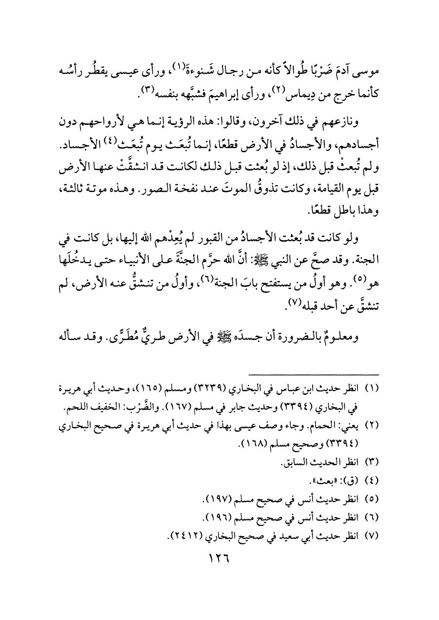 ونازعهم في ذلك آخرون، وقالوا: هذه الرؤية إنما هي لأرواحهم دون أجسادهم، والأجسادُ في الأرض قطعًا، إنما تُبعَث يوم تُبعَث (¬٤) الأجساد. ولم تُبعثْ قبل ذلك، إذ لو بُعثت قبل ذلك لكانت قد انشقَّتْ عنها الأرض قبل يوم القيامة، وكانت تذوقُ الموتَ عند نفخة الصور. وهذه موتة ثالثة، وهذا باطل قطعًا.
