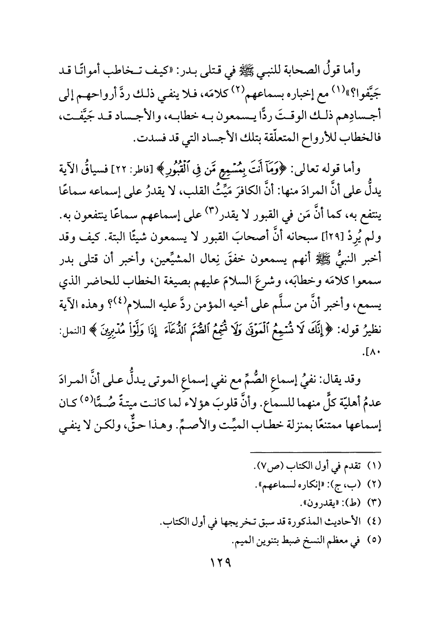 وأما قوله تعالى: {وَمَا أَنْتَ بِمُسْمِعٍ مَنْ فِي الْقُبُورِ} [فاطر: ٢٢] فسياقُ الآية يدلُّ على أنَّ المرادَ منها: أنَّ الكافرَ مَيِّتُ القلب، لا يقدرُ على إسماعه سماعًا ينتفع به، كما أنَّ مَن في القبور لا يقدر (¬٣) على إسماعهم سماعًا ينتفعون به. ولم يُرِدْ [٢٩ أ] سبحانه أنَّ أصحابَ القبور لا يسمعون شيئًا البتة. كيف وقد أخبر النبيُّ - صلى الله عليه وسلم - أنهم يسمعون خفقَ نِعال المشيِّعين، وأخبر أن قتلى بدر سمعوا كلامَه وخطابَه، وشرعَ السلامَ عليهم بصيغة الخطاب للحاضر الذي يسمع، وأخبر أنَّ من سلَّم على أخيه المؤمن ردَّ عليه السلام (¬٤)؟ وهذه الآية نظيرُ قوله: {إِنَّكَ لَا تُسْمِعُ الْمَوْتَى وَلَا تُسْمِعُ الصُّمَّ الدُّعَاءَ إِذَا وَلَّوْا مُدْبِرِينَ} [النمل: ٨٠].