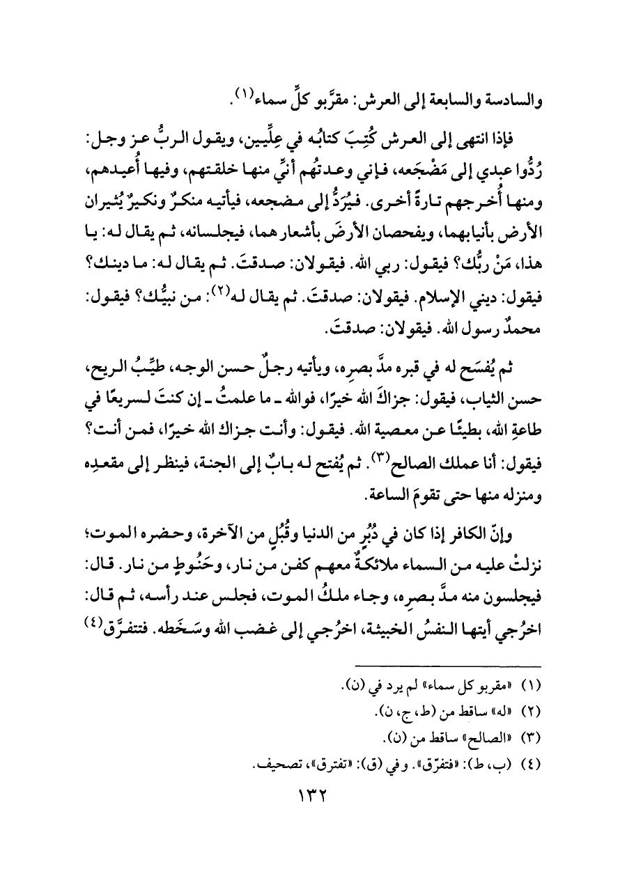 فإذا انتهى إلى العرش كُتِبَ كتابُه في عِلِّيين، ويقول الربُّ عز وجل: رُدُّوا عبدي إلى مَضْجَعه، فإني وعدتُهم أنِّي منها خلقتهم، وفيها أُعيدهم، ومنها أُخرجهم تارةً أخرى. فيُرَدُّ إلى مضجعه، فيأتيه منكرٌ ونكيرٌ يُثيران الأرض بأنيابهما، ويفحصان الأرضَ بأشعارهما، فيجلسانه، ثم يقال له: يا هذا، مَنْ ربُّك؟ فيقول: ربي الله. فيقولان: صدقتَ. ثم يقال له: ما دينك؟ فيقول: ديني الإسلام. فيقولان: صدقتَ. ثم يقال له (¬٢): من نبيُّك؟ فيقول: محمدٌ رسول الله. فيقولان: صدقتَ.