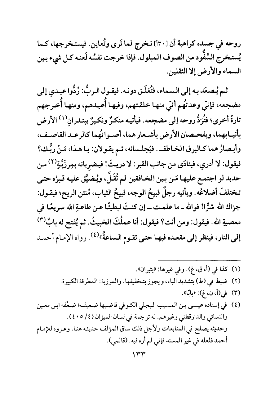 روحه في جسده كراهية أن [٣٠ أ] تخرج لما تَرى وتُعاين. فيستخرجها، كما يُستخرج السَّفُّود من الصوف المبلول. فإذا خرجت نفسُه لَعنه كل شيء بين السماء والأرض إلا الثقلين.