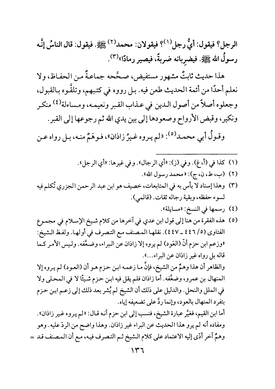 (¬٥) هذه الفقرة من هنا إلى قول ابن عدي في آخرها من كلام شيخ الإسلام في مجموع الفتاوى (٥/ ٤٤٦ ــ ٤٤٧). نقلها المصنف مع التصرف في أولها. ولفظ الشيخ: «وزعم ابن حزم أنّ (العَود) لم يروه إلا زاذان عن البراء، وضعَّفه. وليس الأمر كما قاله بل رواه غير زاذان عن البراء ... ».