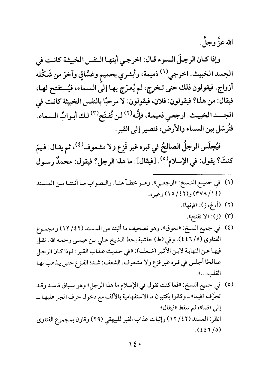 انظر: المسند (٤٢/ ١٢) وإثبات عذاب القبر للبيهقي (٢٩) وقارن بمجموع الفتاوى (٥/ ٤٤٦).