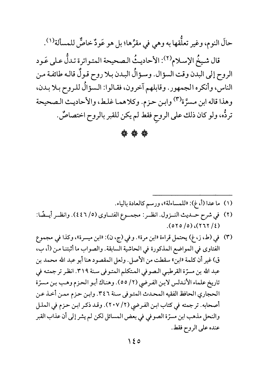 (¬٣) في (ط، ز، غ) يحتمل قراءة «ابن مرة». وفي (ج، ن): «ابن ميسرة»، وكذا في مجموع الفتاوى في المواضع المذكورة في الحاشية السابقة. والصواب ما أثبتنا من (أ، ب، ق) غير أن كلمة «ابن» سقطت من الأصل. ولعل المقصود هنا أبو عبد الله محمد بن عبد الله بن مسرّة القرطبي الصوفي المتكلم المتوفى سنة ٣١٩. انظر ترجمته في تاريخ علماء الأندلس لابن الفرضي (٢/ ٥٥). وهناك أبو الحزم وهب بن مسرّة الحجاري الحافظ الفقيه المحدث المتوفى سنة ٣٤٦. وابن حزم ممن أخذ عن أصحابه. ترجمته في كتاب ابن الفرضي (٢/ ٢٠٧). وقد ذكر ابن حزم في الملل والنحل مذهب ابن مسرّة الصوفي في بعض المسائل لكن لم يشر إلى أن عذاب القبر عنده على الروح فقط.