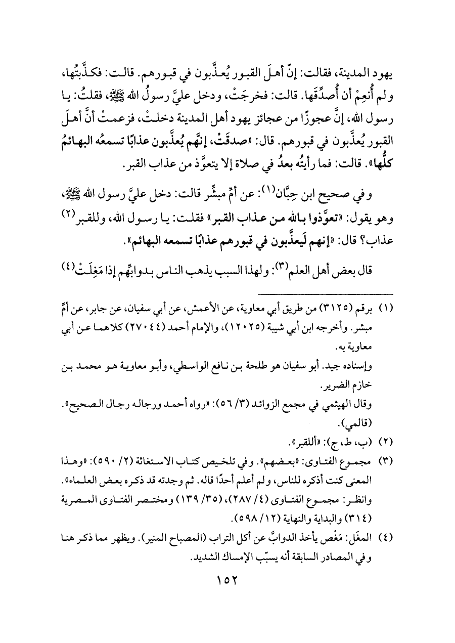 يهود المدينة، فقالت: إنّ أهلَ القبور يُعذَّبون في قبورهم. قالت: فكذَّبتُها، ولم أُنعِمْ أن أُصدِّقَها. قالت: فخرجَتْ، ودخل عليَّ رسولُ الله - صلى الله عليه وسلم -، فقلتُ: يا رسول الله، إنَّ عجوزًا من عجائز يهود أهل المدينة دخلتْ، فزعمتْ أنَّ أهلَ القبور يُعذَّبون في قبورهم. قال: «صدقَتْ، إنَّهم يُعذَّبون عذابًا تسمعُه البهائمُ كلُّها». قالت: فما رأيتُه بعدُ في صلاة إلا يتعوَّذ من عذاب القبر.