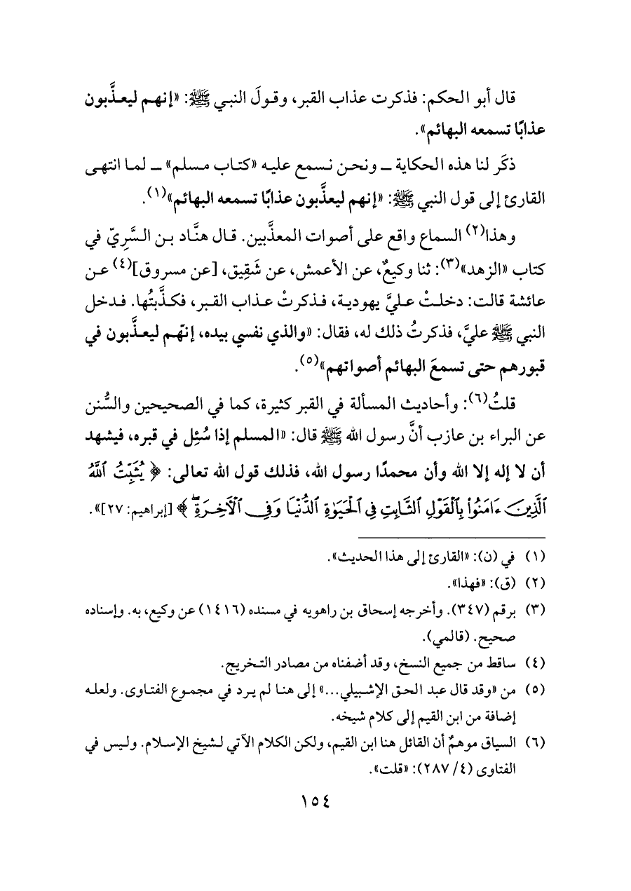وهذا (¬٢) السماع واقع على أصوات المعذَّبين. قال هنَّاد بن السَّرِيّ في كتاب «الزهد» (¬٣): ثنا وكيعٌ، عن الأعمش، عن شَقِيق، [عن مسروق] (¬٤) عن عائشة قالت: دخلتْ عليَّ يهودية، فذكرتْ عذاب القبر، فكذَّبتُها. فدخل النبي - صلى الله عليه وسلم - عليَّ، فذكرتُ ذلك له، فقال: «والذي نفسي بيده، إنّهم ليعذَّبون في قبورهم حتى تسمعَ البهائم أصواتهم» (¬٥).