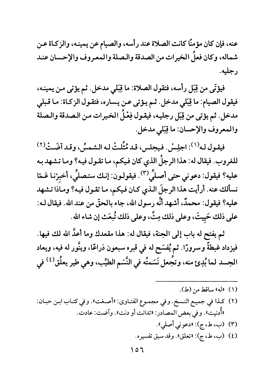 فيقول له (¬١): اجلِسْ. فيجلس، قد مُثِّلتْ له الشمسُ، وقد آضَتْ (¬٢) للغروب. فيقال له: هذا الرجلُ الذي كان فيكم، ما تقول فيه؟ وما تشهد به عليه؟ فيقول: دعوني حتى أصلِّي (¬٣). فيقولون: إنك ستصلِّي، أخبِرْنا عَمّا نسألك عنه. أرأيت هذا الرجلَ الذي كان فيكم، ما تقول فيه؟ وماذا تشهد عليه؟ فيقول: محمدٌ، أشهد أنَّه رسول الله، جاء بالحقّ من عند الله. فيقال له: على ذلك حَيِيتَ، وعلى ذلك مِتَّ، وعلى ذلك تُبعَث إن شاء الله.