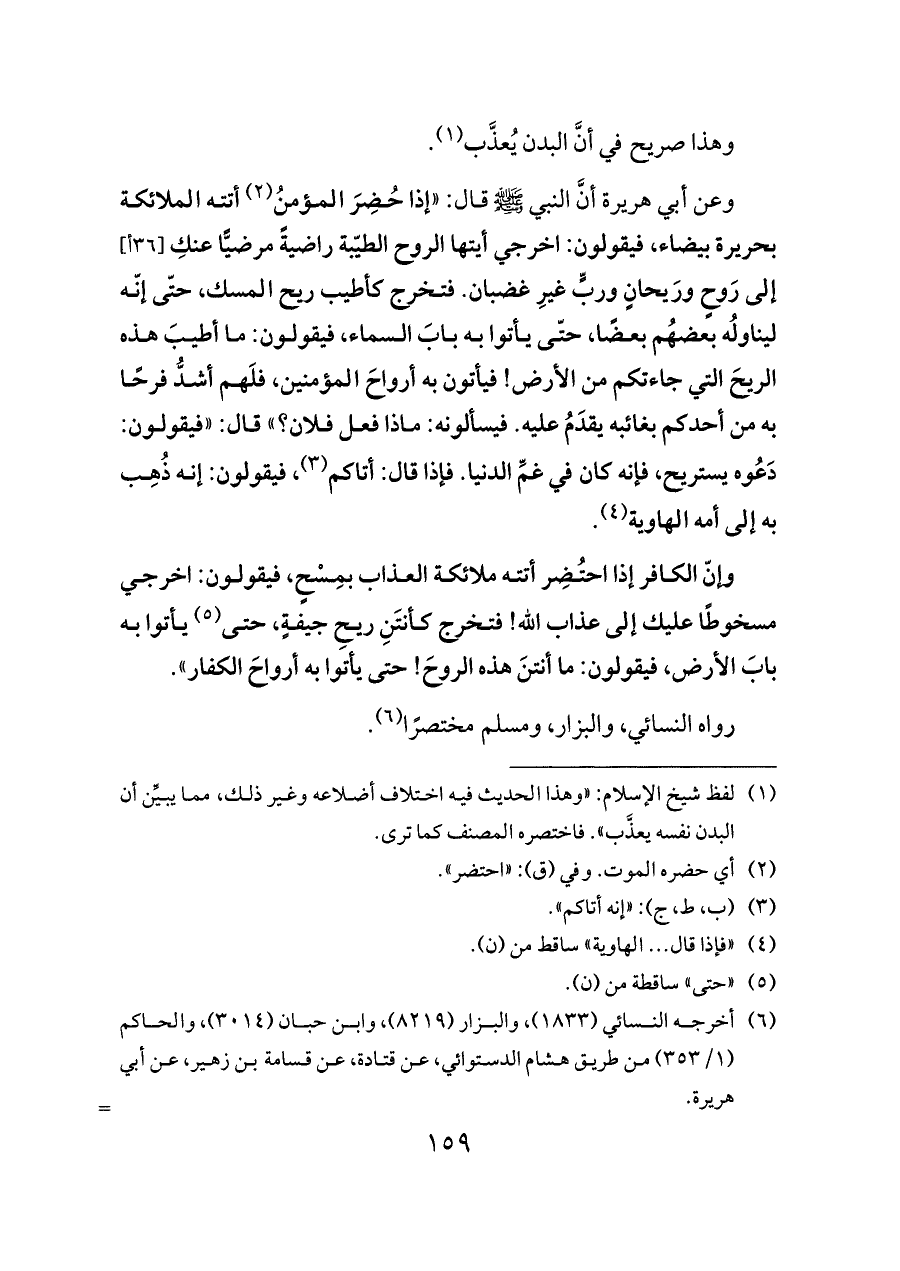 (¬١) لفظ شيخ الإسلام: «وهذا الحديث فيه اختلاف أضلاعه وغير ذلك، مما يبيِّن أن البدن نفسه يعذَّب». فاختصره المصنف كما ترى.