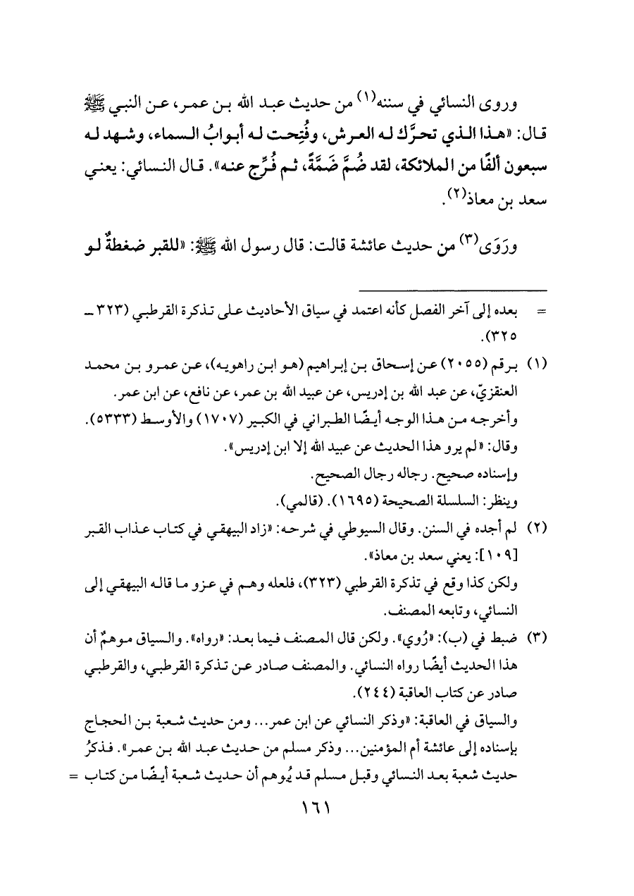 والسياق في العاقبة: «وذكر النسائي عن ابن عمر ... ومن حديث شعبة بن الحجاج بإسناده إلى عائشة أم المؤمنين ... وذكر مسلم من حديث عبد الله بن عمر». فذكرُ حديث شعبة بعد النسائي وقبل مسلم قد يُوهم أن حديث شعبة أيضًا من كتاب النسائي. وسياق القرطبي في التذكرة (٣٢٣): «النسائي عن عبد الله بن عمر ... ومن حديث شعبة ... » إلخ. فتابع عبد الحق بالنص. وليس فيه تصريح بأن حديث شعبة رواه النسائي، خلافًا لابن القيم الذي تصرَّف في النقل، فقال: «رواه من حديث شعبة»، فصرَّح بأنه رواه النسائي، إذ لا مرجع للضمير غيره؛ إلا أن يقال: إن الفاعل سقط من النسخ، وكان في أصل المصنف مثلاً: «رواه [أحمد] من حديث شعبة». والله أعلم.