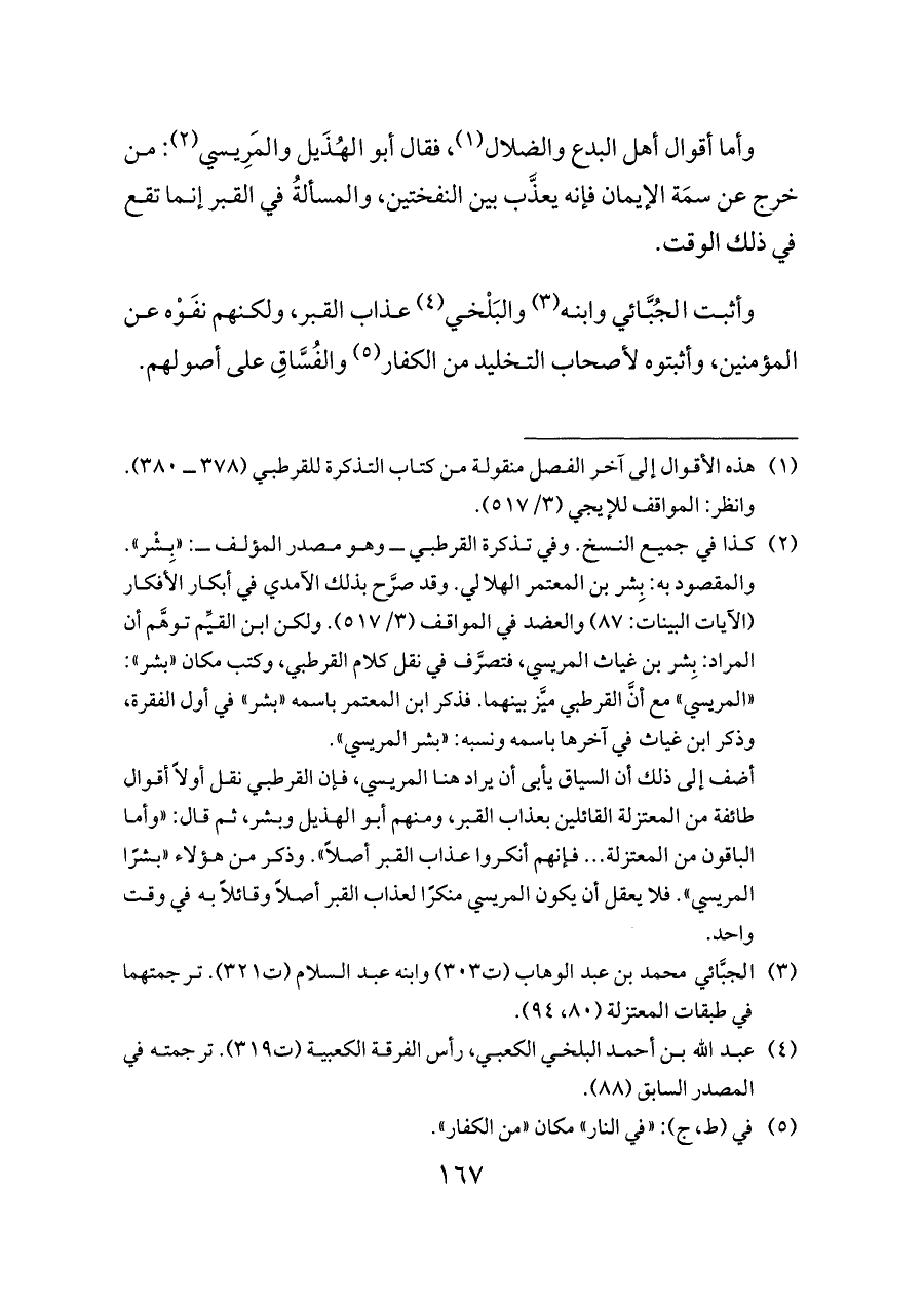 أضف إلى ذلك أن السياق يأبى أن يراد هنا المريسي، فإن القرطبي نقل أولاً أقوال طائفة من المعتزلة القائلين بعذاب القبر، ومنهم أبو الهذيل وبشر، ثم قال: «وأما الباقون من المعتزلة ... فإنهم أنكروا عذاب القبر أصلاً». وذكر من هؤلاء «بشرًا المريسي». فلا يعقل أن يكون المريسي منكرًا لعذاب القبر أصلاً وقائلاً به في وقت واحد.