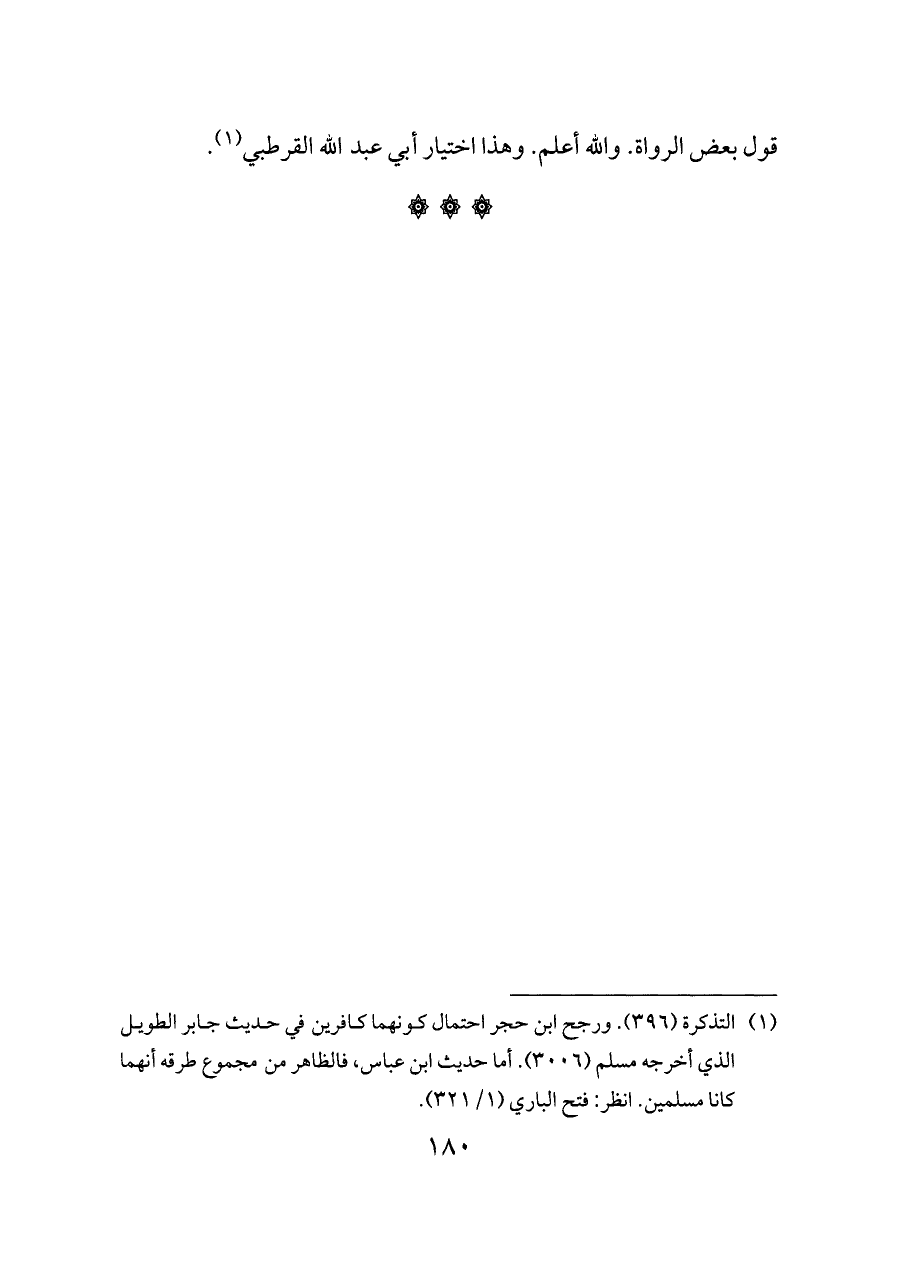 (¬١) التذكرة (٣٩٦). ورجح ابن حجر احتمال كونهما كافرين في حديث جابر الطويل الذي أخرجه مسلم (٣٠٠٦). أما حديث ابن عباس، فالظاهر من مجموع طرقه أنهما كانا مسلمين. انظر: فتح الباري (١/ ٣٢١).
