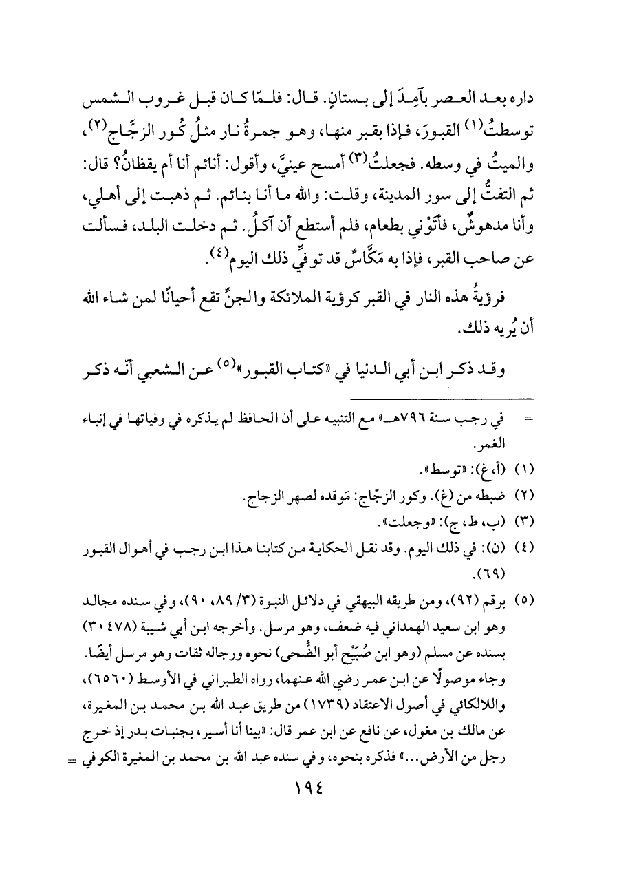 داره بعد العصر بآمِدَ إلى بستانٍ. قال: فلمّا كان قبل غروب الشمس توسطتُ (¬١) القبورَ، فإذا بقبر منها، وهو جمرةُ نار مثلُ كُور الزجَّاج (¬٢)، والميتُ في وسطه. فجعلتُ (¬٣) أمسح عينيَّ، وأقول: أنائم أنا أم يقظانُ؟ قال: ثم التفتُّ إلى سور المدينة، وقلت: والله ما أنا بنائم. ثم ذهبت إلى أهلي، وأنا مدهوشٌ، فأتَوْني بطعام، فلم أستطع أن آكلُ. ثم دخلت البلد، فسألت عن صاحب القبر، فإذا به مَكَّاسٌ قد توفِّي ذلك اليوم (¬٤).