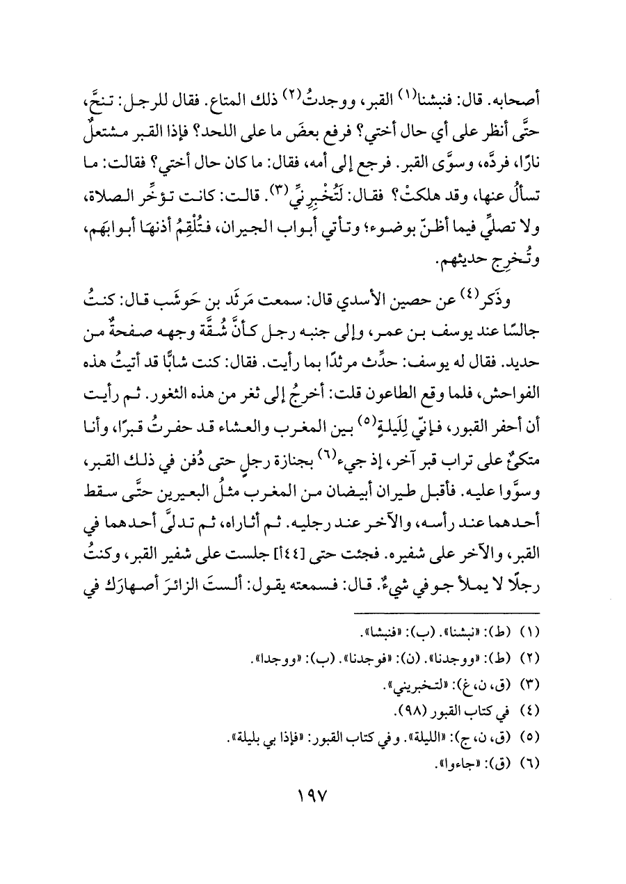 وذَكر (¬٤) عن حصين الأسدي قال: سمعت مَرثَد بن حَوشَب قال: كنتُ جالسًا عند يوسف بن عمر، وإلى جنبه رجل كأنَّ شُقَّة وجهه صفحةٌ من حديد. فقال له يوسف: حدِّث مرثدًا بما رأيت. فقال: كنت شابًّا قد أتيتُ هذه الفواحش، فلما وقع الطاعون قلت: أخرجُ إلى ثغر من هذه الثغور. ثم رأيت أن أحفر القبور، فإنّي لِلَيلةٍ (¬٥) بين المغرب والعشاء قد حفرتُ قبرًا، وأنا متكئٌ على تراب قبر آخر، إذ جيء (¬٦) بجنازة رجلٍ حتى دُفن في ذلك القبر، وسوَّوا عليه. فأقبل طيران أبيضان من المغرب مثلُ البعيرين حتَّى سقط أحدهما عند رأسه، والآخر عند رجليه. ثم أثاراه، ثم تدلَّى أحدهما في القبر، والآخر على شفيره. فجئت حتى [٤٤ أ] جلست على شفير القبر، وكنتُ رجلًا لا يملأ جوفي شيءٌ. قال: فسمعته يقول: ألستَ الزائرَ أصهارَك في