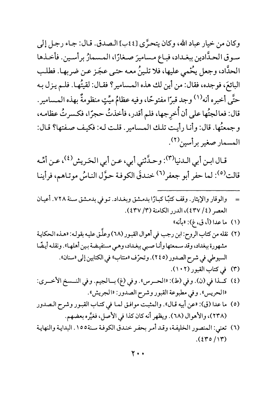 (¬٢) نقله من كتاب الروح: ابن رجب في أهوال القبور (٦٨) وعلَّق عليه بقوله: «هذه الحكاية مشهورة ببغداد، وقد سمعتها وأنا صبي ببغداد، وهي مستفيضة بين أهلها». ونقله أيضًا السيوطي في شرح الصدور (٢٤٥). وتحرّف «منتاب» في الكتابين إلى «سنان».