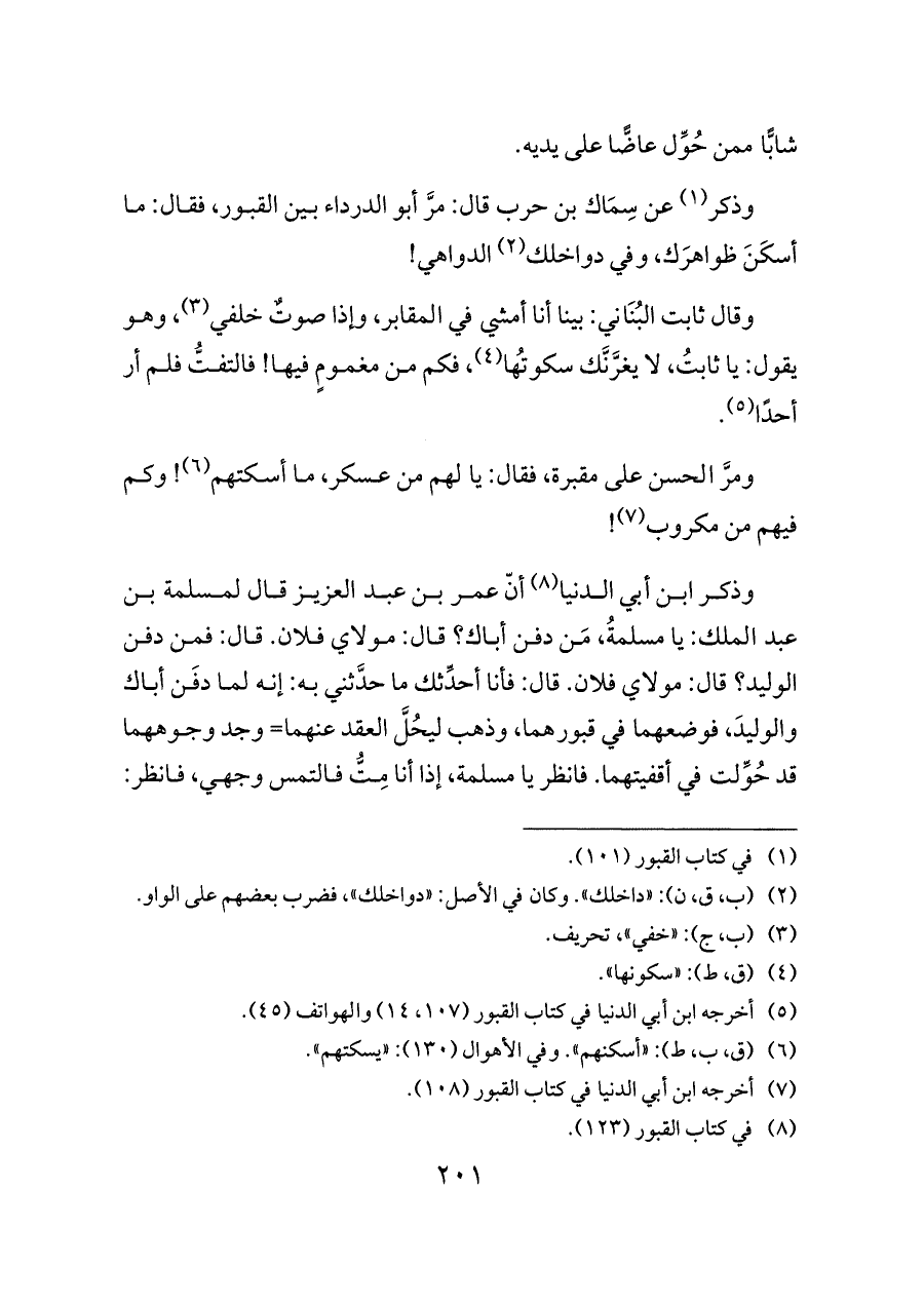 (¬٥) أخرجه ابن أبي الدنيا في كتاب القبور (١٠٧، ١٤) والهواتف (٤٥).