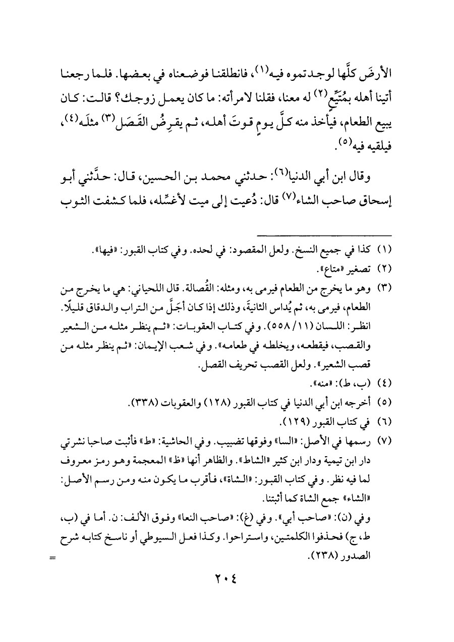 (¬٧) رسمها في الأصل: «السا» وفوقها تضبيب. وفي الحاشية: «ط» فأثبت صاحبا نشرتي دار ابن تيمية ودار ابن كثير «الشاط». والظاهر أنها «ظ» المعجمة وهو رمز معروف لما فيه نظر. وفي كتاب القبور: «الشاة»، فأقرب ما يكون منه ومن رسم الأصل: «الشاء» جمع الشاة كما أثبتنا.