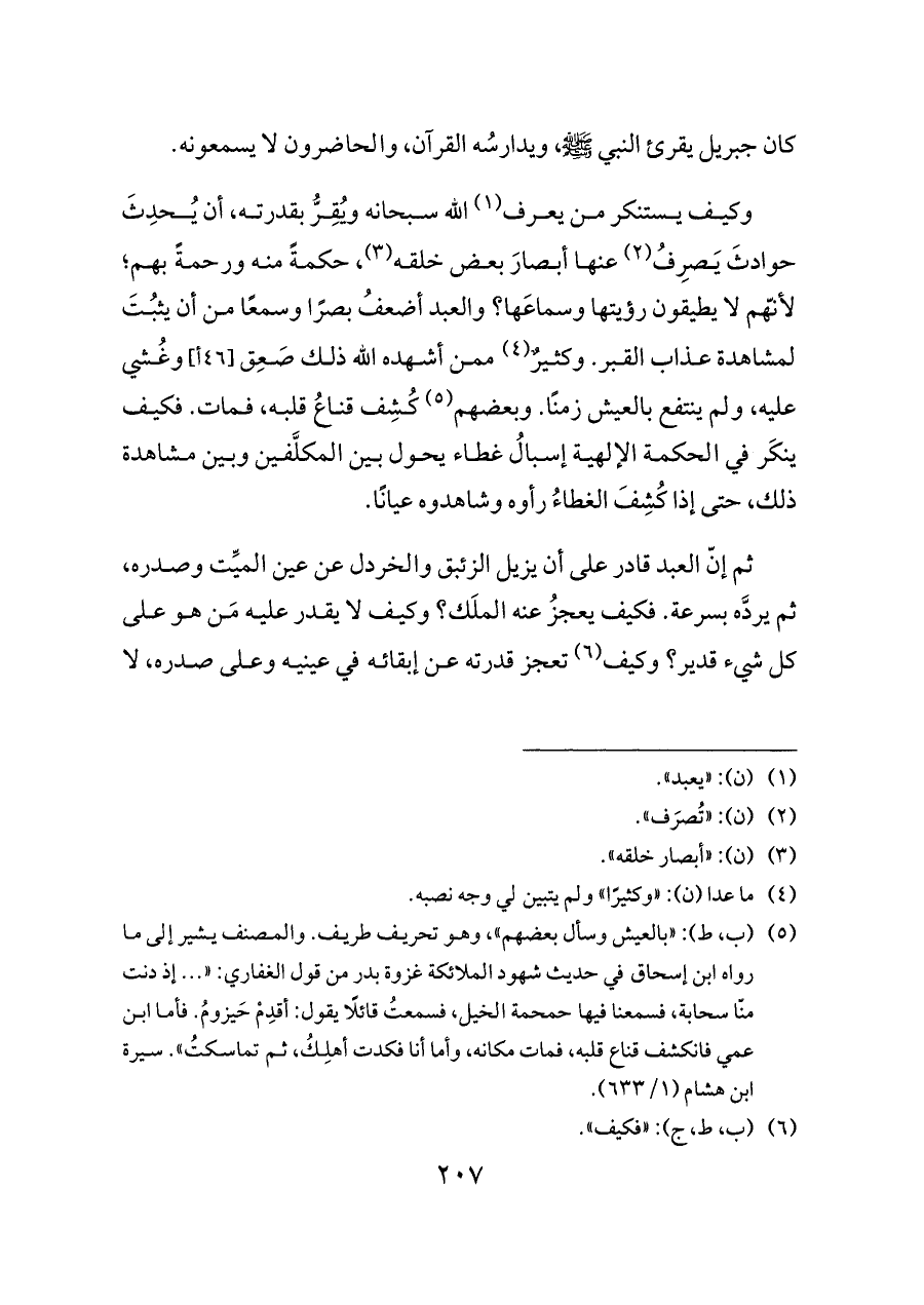 وكيف يستنكر من يعرف (¬١) الله سبحانه ويُقِرُّ بقدرته، أن يُحدِثَ حوادثَ يَصرِفُ (¬٢) عنها أبصارَ بعض خلقه (¬٣)، حكمةً منه ورحمةً بهم؛ لأنّهم لا يطيقون رؤيتها وسماعَها؟ والعبد أضعفُ بصرًا وسمعًا من أن يثبُتَ لمشاهدة عذاب القبر. وكثيرٌ (¬٤) ممن أشهده الله ذلك صَعِق [٤٦ أ] وغُشي عليه، ولم ينتفع بالعيش زمنًا. وبعضهم (¬٥) كُشِف قناعُ قلبه، فمات. فكيف ينكَر في الحكمة الإلهية إسبالُ غطاء يحول بين المكلَّفين وبين مشاهدة ذلك، حتى إذا كُشِفَ الغطاءُ رأوه وشاهدوه عيانًا.