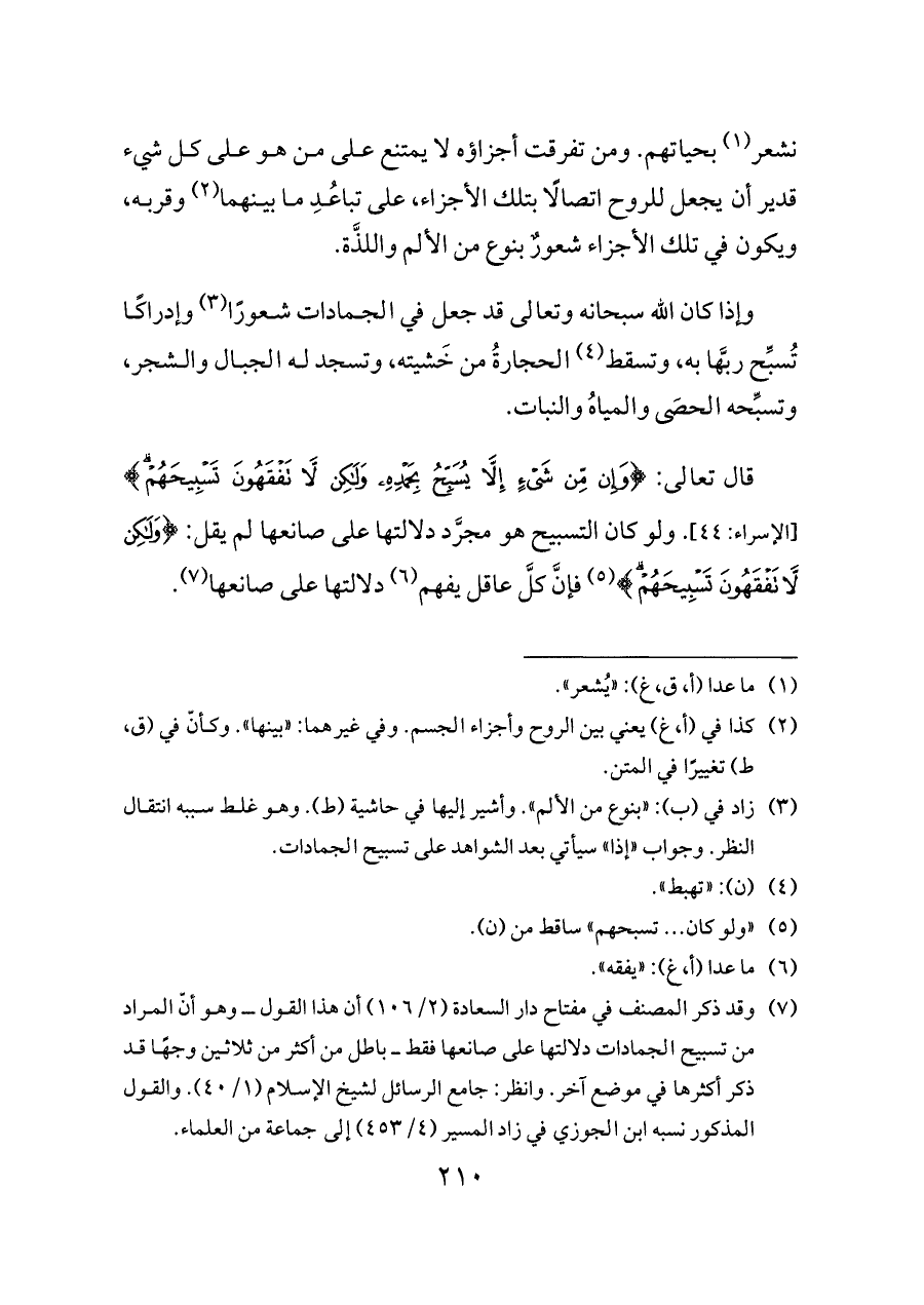 (¬٧) وقد ذكر المصنف في مفتاح دار السعادة (٢/ ١٠٦) أن هذا القول ــ وهو أنّ المراد من تسبيح الجمادات دلالتها على صانعها فقط ــ باطل من أكثر من ثلاثين وجهًا قد ذكر أكثرها في موضع آخر. وانظر: جامع الرسائل لشيخ الإسلام (١/ ٤٠). والقول المذكور نسبه ابن الجوزي في زاد المسير (٤/ ٤٥٣) إلى جماعة من العلماء.