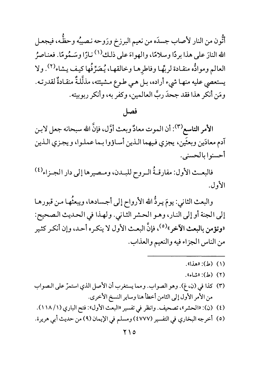 والبعث الثاني: يومَ يردُّ الله الأرواح إلى أجسادها، ويبعثُها من قبورها إلى الجنة أو إلى النار، وهو الحشر الثاني. ولهذا في الحديث الصحيح: «وتؤمن بالبعث الآخر» (¬٥)، فإنَّ البعث الأول لا ينكره أحد، وإن أنكر كثير من الناس الجزاء فيه والنعيم والعذاب.