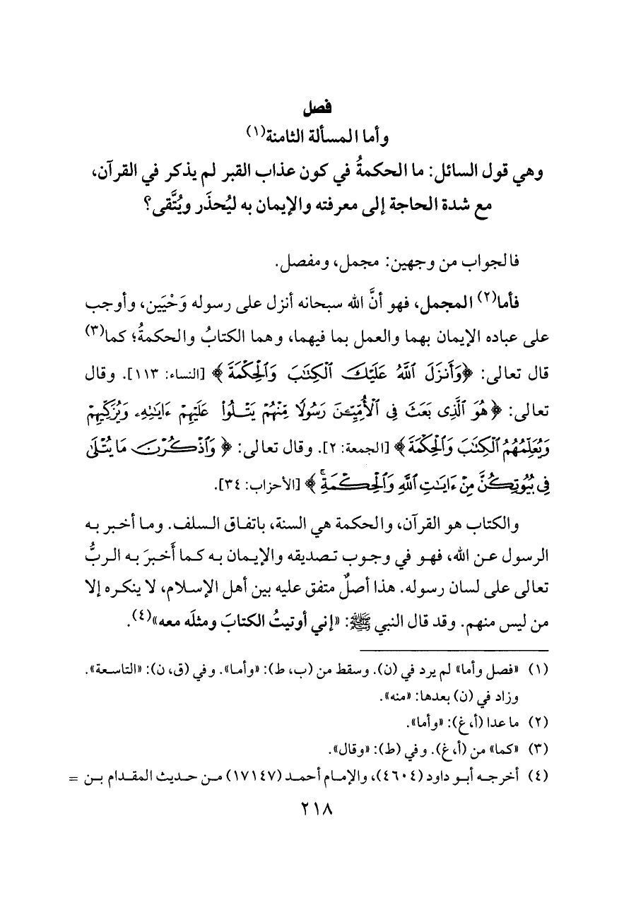 فأما (¬٢) المجمل، فهو أنَّ الله سبحانه أنزل على رسوله وَحْيَين، وأوجب على عباده الإيمان بهما والعمل بما فيهما، وهما الكتابُ والحكمةُ؛ كما (¬٣) قال تعالى: {وَأَنْزَلَ اللَّهُ عَلَيْكَ الْكِتَابَ وَالْحِكْمَةَ} [النساء: ١١٣]. وقال تعالى: {هُوَ الَّذِي بَعَثَ فِي الْأُمِّيِّينَ رَسُولًا مِنْهُمْ يَتْلُو عَلَيْهِمْ آيَاتِهِ وَيُزَكِّيهِمْ وَيُعَلِّمُهُمُ الْكِتَابَ وَالْحِكْمَةَ} [الجمعة: ٢]. وقال تعالى: {وَاذْكُرْنَ مَا يُتْلَى فِي بُيُوتِكُنَّ مِنْ آيَاتِ اللَّهِ وَالْحِكْمَةِ} [الأحزاب: ٣٤].