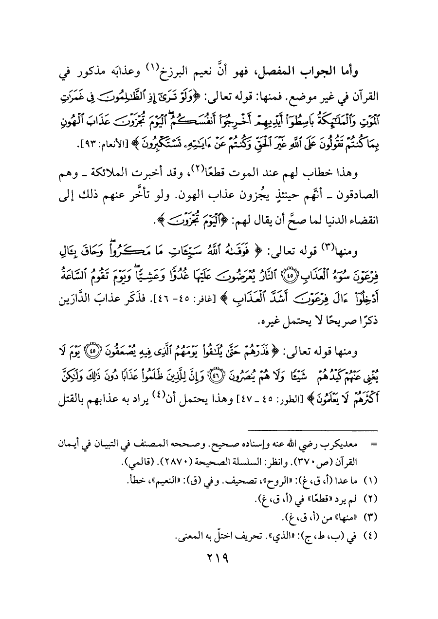 وأما الجواب المفصل، فهو أنَّ نعيم البرزخ (¬١) وعذابَه مذكور في القرآن في غير موضع. فمنها: قوله تعالى: {وَلَوْ تَرَى إِذِ الظَّالِمُونَ فِي غَمَرَاتِ الْمَوْتِ وَالْمَلَائِكَةُ بَاسِطُو أَيْدِيهِمْ أَخْرِجُوا أَنْفُسَكُمُ الْيَوْمَ تُجْزَوْنَ عَذَابَ الْهُونِ بِمَا كُنْتُمْ تَقُولُونَ عَلَى اللَّهِ غَيْرَ الْحَقِّ وَكُنْتُمْ عَنْ آيَاتِهِ تَسْتَكْبِرُونَ} [الأنعام: ٩٣].