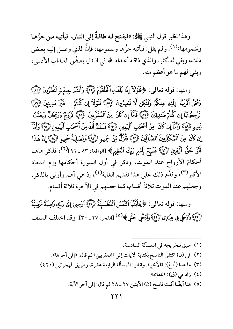 ومنها: قوله تعالى: {فَلَوْلَا إِذَا بَلَغَتِ الْحُلْقُومَ (٨٣) وَأَنْتُمْ حِينَئِذٍ تَنْظُرُونَ (٨٤) وَنَحْنُ أَقْرَبُ إِلَيْهِ مِنْكُمْ وَلَكِنْ لَا تُبْصِرُونَ (٨٥) فَلَوْلَا إِنْ كُنْتُمْ غَيْرَ مَدِينِينَ (٨٦) تَرْجِعُونَهَا إِنْ كُنْتُمْ صَادِقِينَ (٨٧) فَأَمَّا إِنْ كَانَ مِنَ الْمُقَرَّبِينَ (٨٨) فَرَوْحٌ وَرَيْحَانٌ وَجَنَّتُ نَعِيمٍ (٨٩) وَأَمَّا إِنْ كَانَ مِنْ أَصْحَابِ الْيَمِينِ (٩٠) فَسَلَامٌ لَكَ مِنْ أَصْحَابِ الْيَمِينِ (٩١) وَأَمَّا إِنْ كَانَ مِنَ الْمُكَذِّبِينَ الضَّالِّينَ (٩٢) فَنُزُلٌ مِنْ حَمِيمٍ (٩٣) وَتَصْلِيَةُ جَحِيمٍ (٩٤) إِنَّ هَذَا لَهُوَ حَقُّ الْيَقِينِ (٩٥) فَسَبِّحْ بِاسْمِ رَبِّكَ الْعَظِيمِ} [الواقعة: ٨٣ ــ ٩٦] (¬٢)، فذكر هاهنا أحكامَ الأرواح عند الموت، وذكر في أول السورة أحكامها يوم المعاد الأكبر (¬٣)، وقدَّم ذلك على هذا تقديم الغاية (¬٤)، إذ هي أهم وأولى بالذكر. وجعلهم عند الموت ثلاثةَ أقسام، كما جعلهم في الآخرة ثلاثة أقسام.