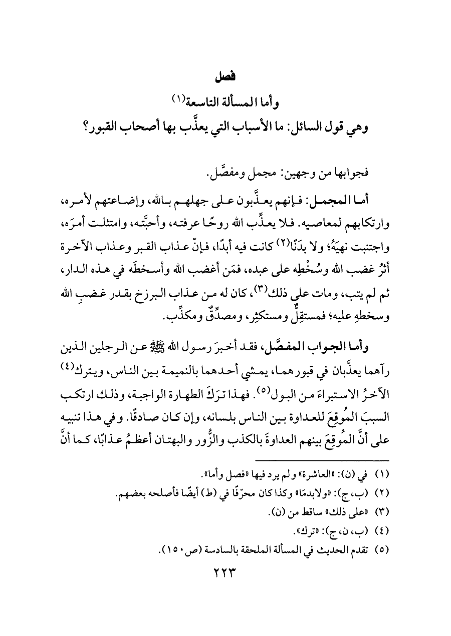 وأما الجواب المفصَّل، فقد أخبرَ رسول الله - صلى الله عليه وسلم - عن الرجلين الذين رآهما يعذَّبان في قبورهما، يمشي أحدهما بالنميمة بين الناس، ويترك (¬٤) الآخرُ الاستبراءَ من البول (¬٥). فهذا ترَكَ الطهارة الواجبة، وذلك ارتكب السببَ المُوقِعَ للعداوة بين الناس بلسانه، وإن كان صادقًا. وفي هذا تنبيه على أنَّ المُوقِعَ بينهم العداوةَ بالكذب والزُّور والبهتان أعظمُ عذابًا، كما أنَّ