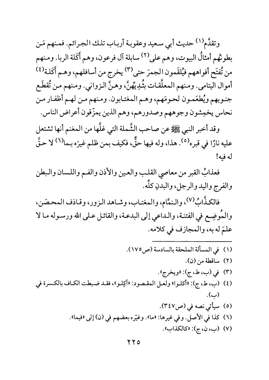 وتقدَّم (¬١) حديث أبي سعيد وعقوبة أرباب تلك الجرائم. فمنهم مَن بطونُهم أمثالُ البيوت، وهم على (¬٢) سابلة آل فرعون، وهم أَكَلة الربا. ومنهم من تُفتَح أفواههم فيُلقَمون الجمرَ حتى (¬٣) يخرج من أسافلهم، وهم أَكَلة (¬٤) أموال اليتامى. ومنهم المعلَّقات بثُدِيِّهنَّ، وهنَّ الزواني. ومنهم من تُقطَع جنوبهم ويُطعَمون لحومَهم، وهم المغتابون. ومنهم من لهم أظفار من نحاس يخمِشون وجوههم وصدورهم، وهم الذين يمزّقون أعراض الناس.
