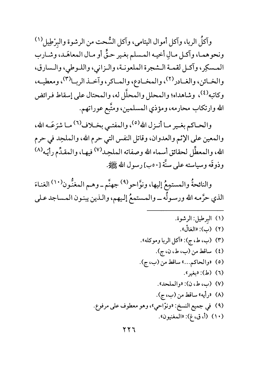 وآكلُ الربا، وآكل أموال اليتامى، وآكل السُّحت من الرشوة والبِرْطِيل (¬١) ونحوهما، وآكل مالِ أخيه المسلم بغير حقٍّ أو مال المعاهَد، وشارب المسكِر، وآكل لقمة الشجرة الملعونة، والزاني، واللوطي، والسارق، والخائن، والغادر (¬٢)، والمخادع، والماكر، وآخذ الربا (¬٣)، ومعطيه، وكاتبه (¬٤)، وشاهداه؛ والمحلل والمحلَّل له، والمحتال على إسقاط فرائض الله وارتكاب محارمه، ومؤذي المسلمين، ومتَّبع عوراتهم.