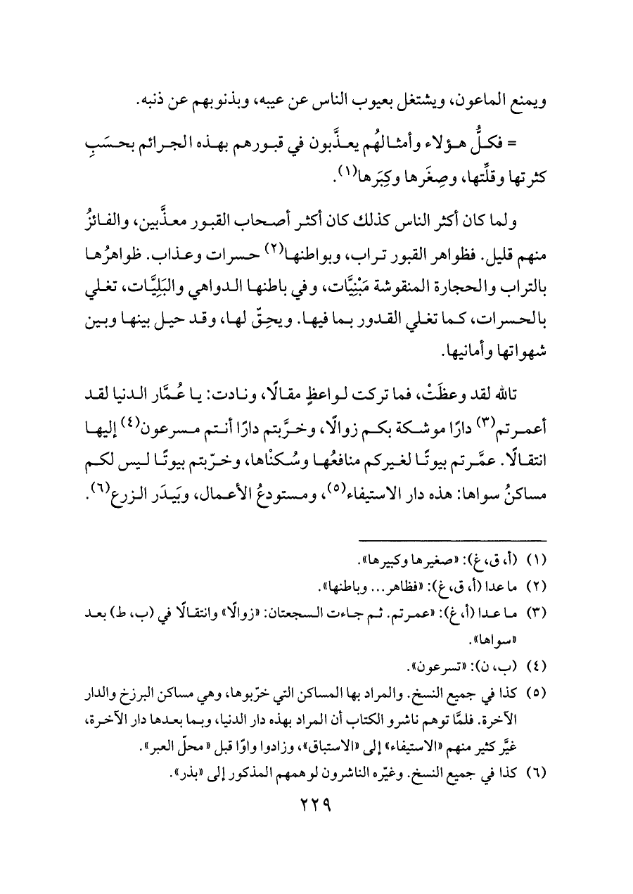 (¬٥) كذا في جميع النسخ. والمراد بها المساكن التي خرّبوها، وهي مساكن البرزخ والدار الآخرة. فلمَّا توهم ناشرو الكتاب أن المراد بهذه دار الدنيا، وبما بعدها دار الآخرة، غيَّر كثير منهم «الاستيفاء» إلى «الاستباق»، وزادوا واوًا قبل «محلّ العبر».