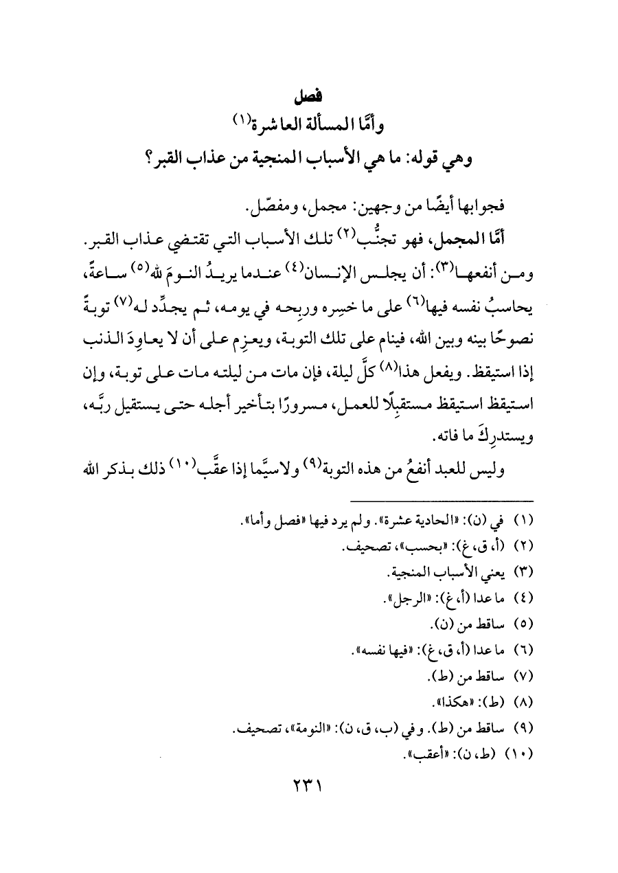أمَّا المجمل، فهو تجنُّب (¬٢) تلك الأسباب التي تقتضي عذاب القبر. ومن أنفعها (¬٣): أن يجلس الإنسان (¬٤) عندما يريدُ النومَ لله (¬٥) ساعةً، يحاسبُ نفسه فيها (¬٦) على ما خسِره وربِحه في يومه، ثم يجدِّد له (¬٧) توبةً نصوحًا بينه وبين الله، فينام على تلك التوبة، ويعزِم على أن لا يعاوِدَ الذنب إذا استيقظ. ويفعل هذا (¬٨) كلَّ ليلة، فإن مات من ليلته مات على توبة، وإن استيقظ استيقظ مستقبِلًا للعمل، مسرورًا بتأخير أجله حتى يستقيل ربَّه، ويستدرِكَ ما فاته.