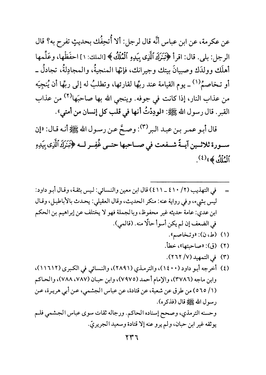 قال أبو عمر بن عبد البر (¬٣): وصحَّ عن رسول الله - صلى الله عليه وسلم - أنه قال: «إن سورة ثلاثين آيةً شفعت في صاحبها حتى غُفِر له {تَبَارَكَ الَّذِي بِيَدِهِ الْمُلْكُ}» (¬٤).