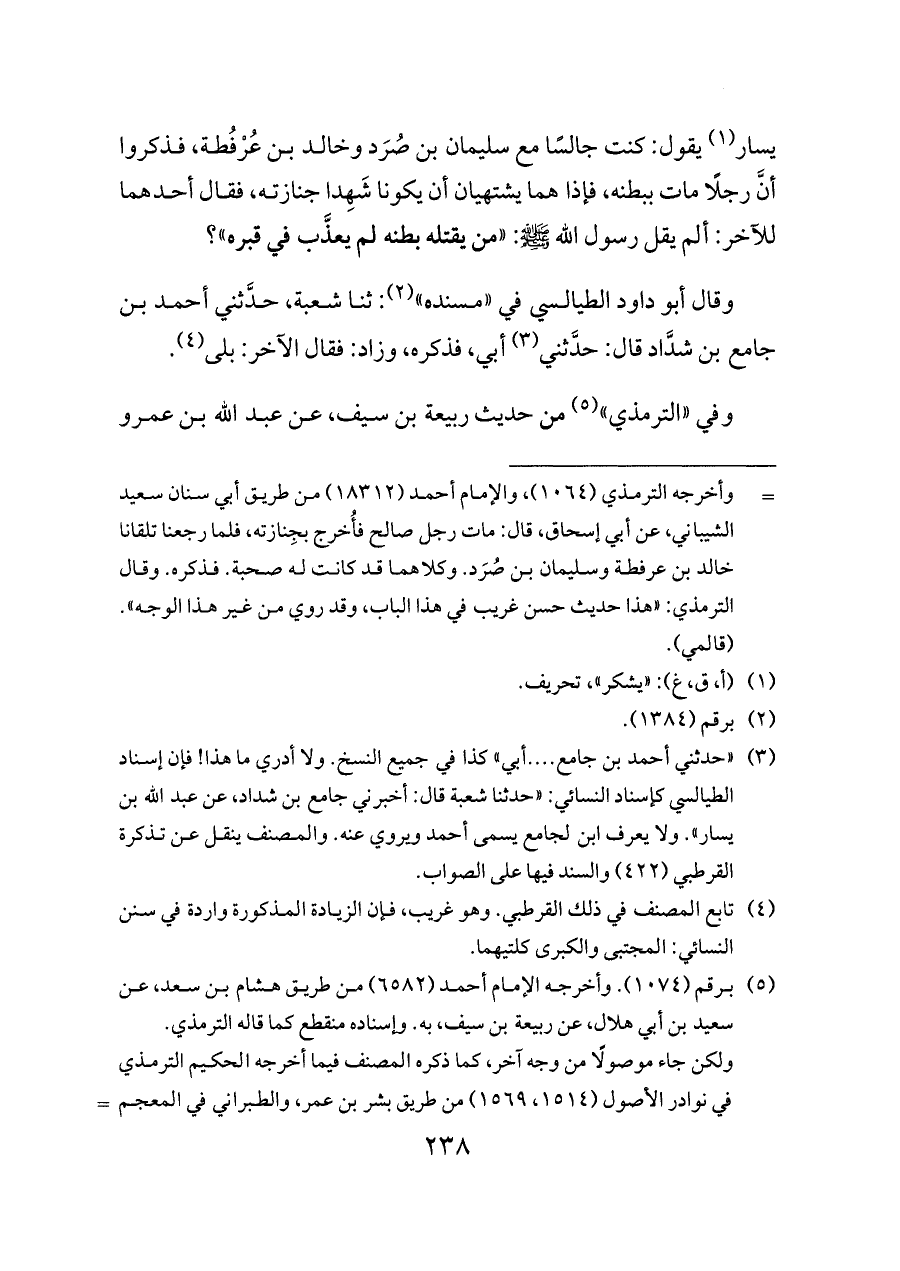 (¬٣) «حدثني أحمد بن جامع .... أبي» كذا في جميع النسخ. ولا أدري ما هذا! فإن إسناد الطيالسي كإسناد النسائي: «حدثنا شعبة قال: أخبرني جامع بن شداد، عن عبد الله بن يسار». ولا يعرف ابن لجامع يسمى أحمد ويروي عنه. والمصنف ينقل عن تذكرة القرطبي (٤٢٢) والسند فيها على الصواب.