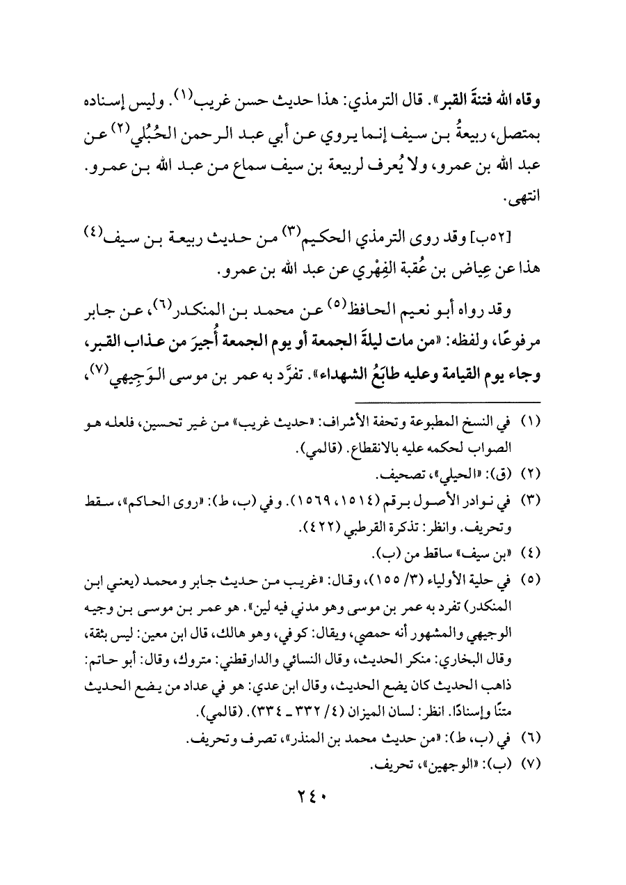 وقد رواه أبو نعيم الحافظ (¬٥) عن محمد بن المنكدر (¬٦)، عن جابر مرفوعًا، ولفظه: «من مات ليلةَ الجمعة أو يوم الجمعة أُجيرَ من عذاب القبر، وجاء يوم القيامة وعليه طابَعُ الشهداء». تفرَّد به عمر بن موسى الوَجِيهي (¬٧)،