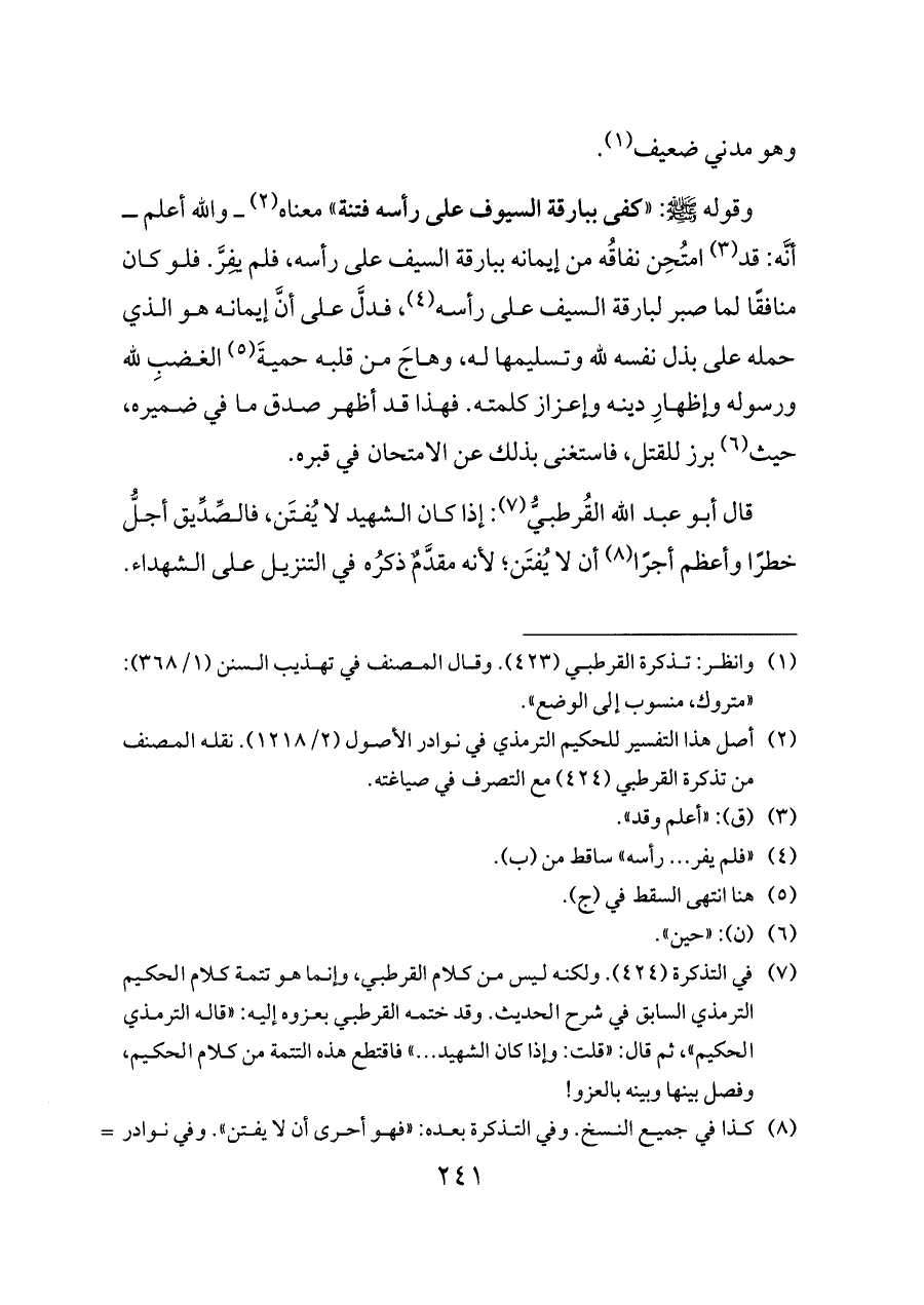 (¬٧) في التذكرة (٤٢٤). ولكنه ليس من كلام القرطبي، وإنما هو تتمة كلام الحكيم الترمذي السابق في شرح الحديث. وقد ختمه القرطبي بعزوه إليه: «قاله الترمذي الحكيم»، ثم قال: «قلت: وإذا كان الشهيد ... » فاقتطع هذه التتمة من كلام الحكيم، وفصل بينها وبينه بالعزو!