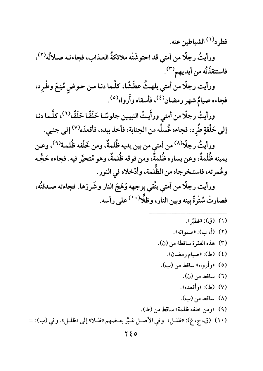 ورأيتُ رجلًا من أمتي قد احتوشَتْه ملائكةُ العذاب، فجاءته صلاتُه (¬٢)، فاستنقذَتُه من أيديهم (¬٣).