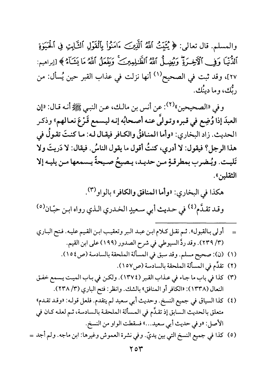 (¬٥) كذا في جميع النسخ التي بين يديّ. وفي نشرة العموش وغيرها: ابن ماجه. ولم أجد عزوه إلى ابن ماجه ولا إلى ابن حبان. وقد عزاه السيوطي في شرح الصدور (١٨٤) إلى أحمد، والبزار، وابن أبي الدنيا، وابن أبي عاصم في السُّنة، وابن مردويه، والبيهقي. أما ابن حبَّان فقد أخرج حديث أبي هريرة، وقد تقدَّم في المسألة الملحقة بالسادسة.