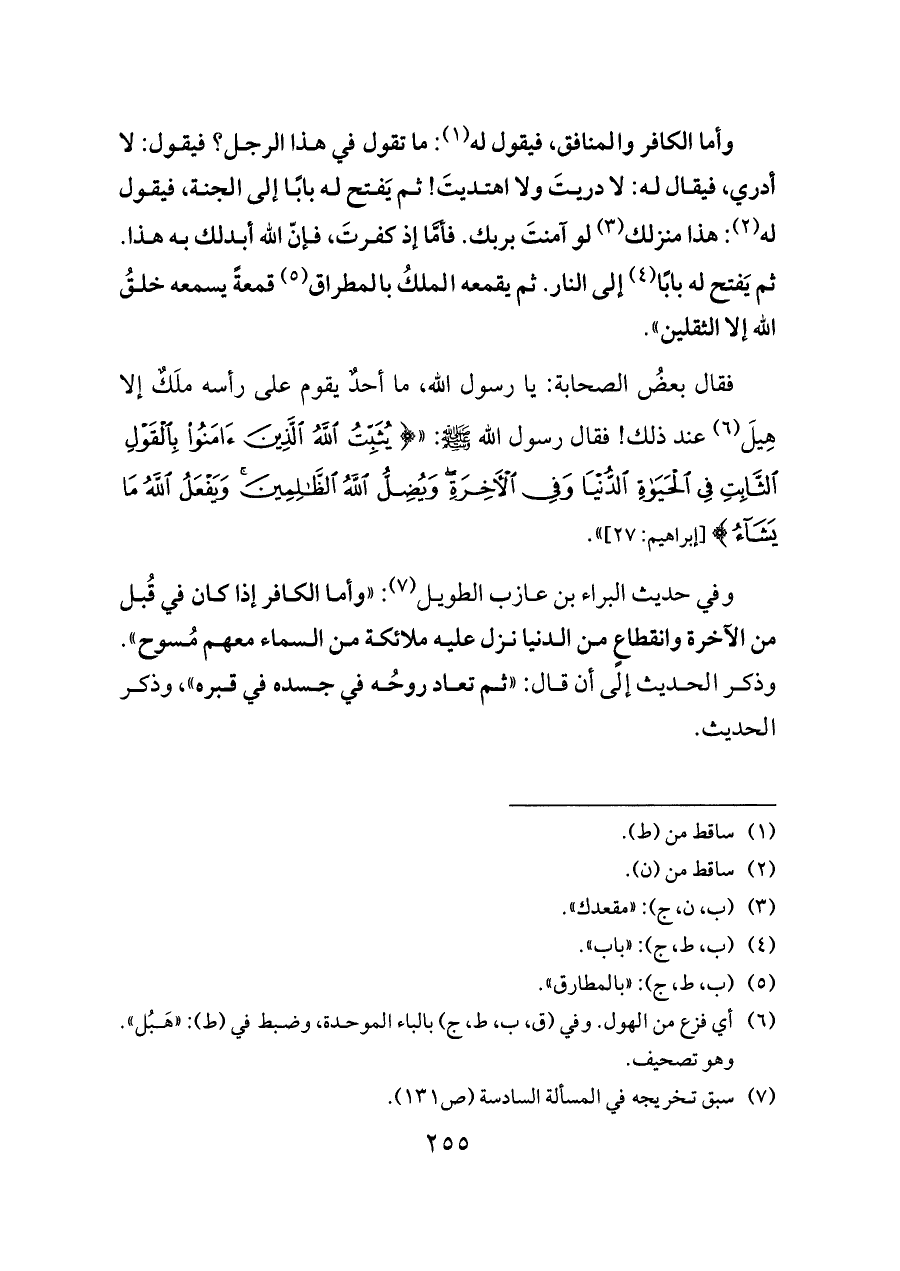 فقال بعضُ الصحابة: يا رسول الله، ما أحدٌ يقوم على رأسه ملَكٌ إلا هِيلَ (¬٦) عند ذلك! فقال رسول الله - صلى الله عليه وسلم -: «{يُثَبِّتُ اللَّهُ الَّذِينَ آمَنُوا بِالْقَوْلِ الثَّابِتِ فِي الْحَيَاةِ الدُّنْيَا وَفِي الْآخِرَةِ وَيُضِلُّ اللَّهُ الظَّالِمِينَ وَيَفْعَلُ اللَّهُ مَا يَشَاءُ} [إبراهيم: ٢٧]».