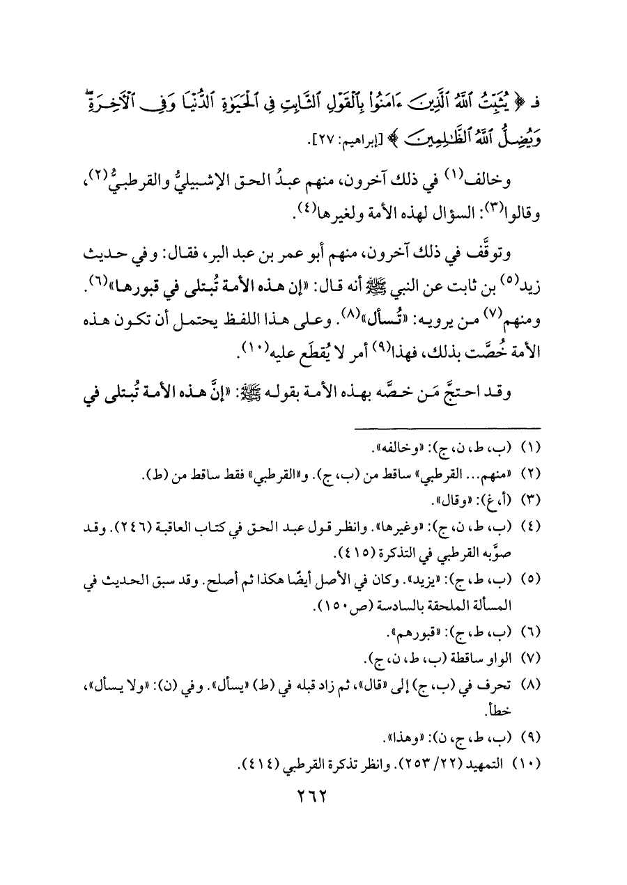 وتوقَّف في ذلك آخرون، منهم أبو عمر بن عبد البر، فقال: وفي حديث زيد (¬٥) بن ثابت عن النبي - صلى الله عليه وسلم - أنه قال: «إن هذه الأمة تُبتلى في قبورها» (¬٦). ومنهم (¬٧) من يرويه: «تُسأل» (¬٨). وعلى هذا اللفظ يحتمل أن تكون هذه الأمة خُصَّت بذلك، فهذا (¬٩) أمر لا يُقطَع عليه (¬١٠).